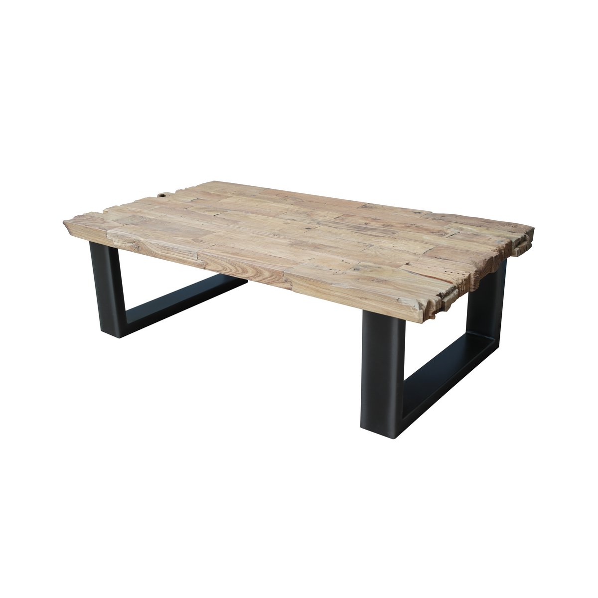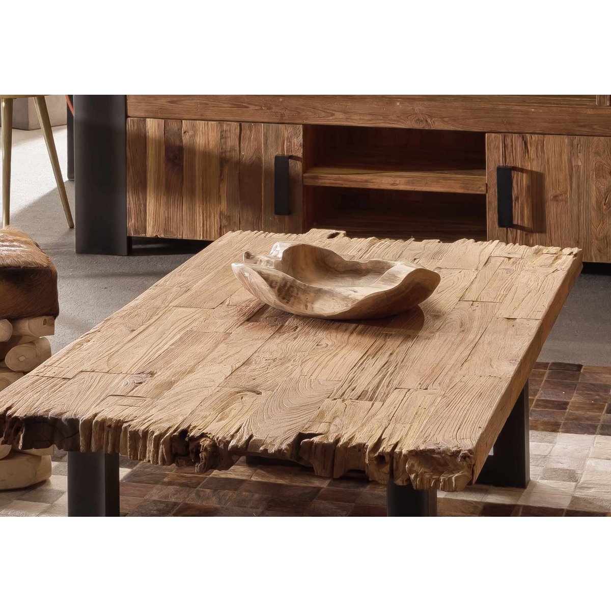 Dieser Couchtisch in Landhausoptik wirkt gradlinig und modern. Die Tischplatte besteht aus recyceltem Teak-Holz und überzeugt mit unregelmäßiger Kante an den kurzen Seiten. Das schwarze Metallgestell sieht nicht nur edel aus, es passt auch perfekt zu der Tischplatte. Hier ist jedes Stück ein Unikat und ein absoluter Blickfang in Ihren Räumen. Plattenstärke ca. 45 mm.
