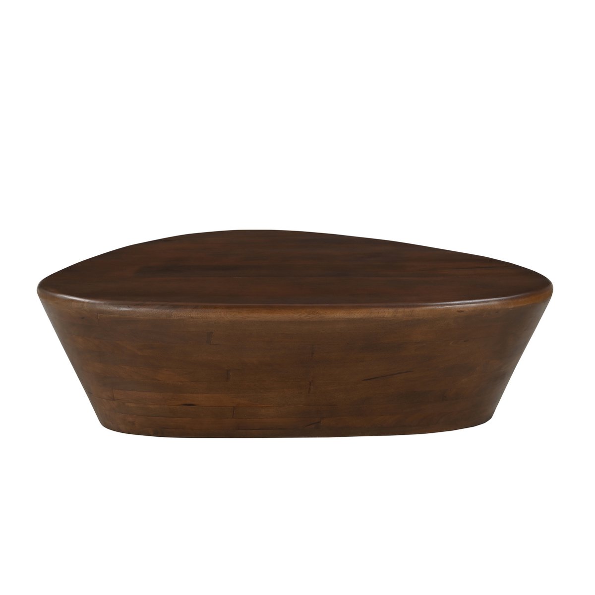 Dieser Couchtisch aus massivem Mangoholz ist ein echtes Highlight in jedem Wohnraum. Mit seiner markanten, dreieckigen Tischplatte und der Fertigung aus einem einzigen Stück Holz verkörpert er minimalistisches Design und natürliche Ästhetik. Das verwendete Mangoholz überzeugt durch seine Langlebigkeit und die einzigartige Maserung, die jedem Stück seinen eigenen Charakter verleiht. Die warme, braune Farbgebung des Holzes strahlt eine angenehme Behaglichkeit aus und bringt gleichzeitig ein Stück Natur in Ihre vier Wände. Die abgerundete dreieckige Tischplatte ist ein Blickfang und verleiht dem Tisch eine moderne, skulpturale Note. Durch diese ungewöhnliche Form wirkt der Tisch nicht nur besonders elegant, sondern schafft auch einen frischen Akzent in jeder Raumgestaltung. Die geometrische Form ist ideal für das kreative Einrichten, sei es in einer Ecke oder als Kontrast zu runden und rechteckigen Möbeln. Was diesen Couchtisch besonders auszeichnet, ist die Fertigung aus einem Stück. Ohne sichtbare Verbindungen oder Übergänge entsteht ein harmonischer, fließender Look, der das Auge anzieht. Die solide Konstruktion garantiert zudem Stabilität und Langlebigkeit. Ob als stilvoller Couchtisch zum Sofa oder als dekorativer Akzent in einer Leseecke – dieser Tisch ist vielseitig einsetzbar. Dank seines kompakten Designs passt er perfekt in kleinere Räume oder als Ergänzung zu anderen Möbelstücken. Maße der Tischplatte: ca. 107x78 cm