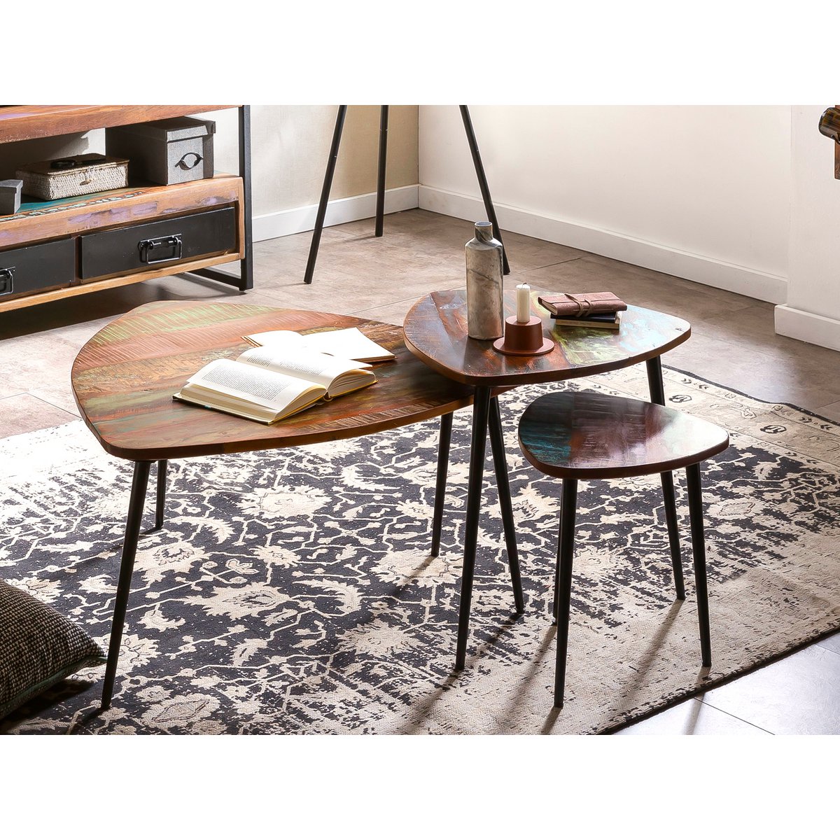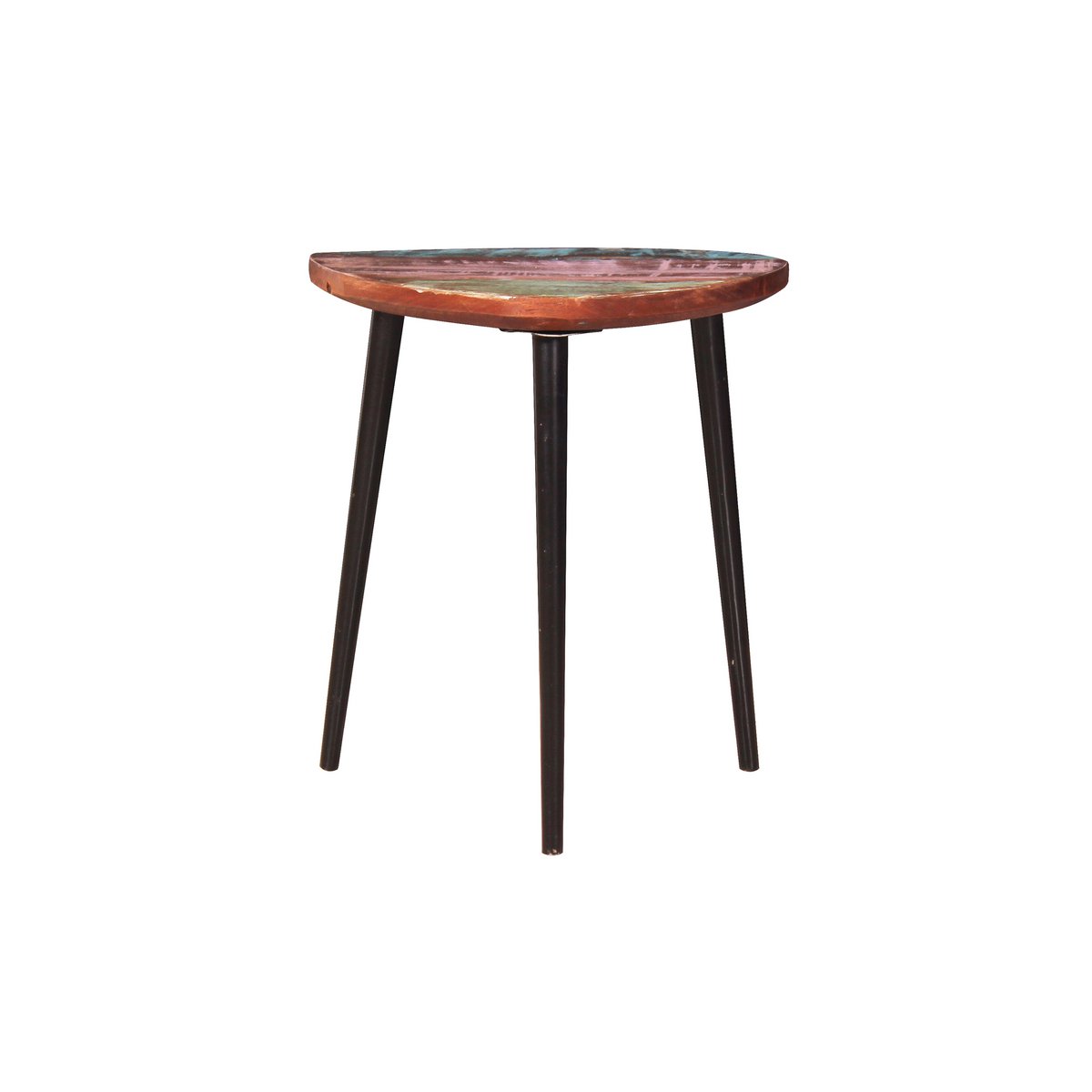 Dieser moderne Beistelltisch in einer Kombination aus Shabby Chic und Factory Design ist eine Bereicherung in jedem Ambiente. Die dreieckige Form mit abgerundeten Ecken mit 3 konisch zulaufenden Metallbeinen lassen ihn zudem etwas Retro wirken. Das Metall und das Holz wurden ebenfalls auf alt getrimmt, um ein stimmiges Bild zu erreichen, das recycelte Altholz ist in bunten Farben bemalt, so dass jedes Teil zum Unikat wird. Gerade in Kombination mit bereits vorhandenem Interior ist es sehr reizvoll und schon wenige Teile reichen, um ein völlig neues Ambiente zu erschaffen. Hergestellt aus FSC-zertifiziertem Holz. Abgerundete Ecken.