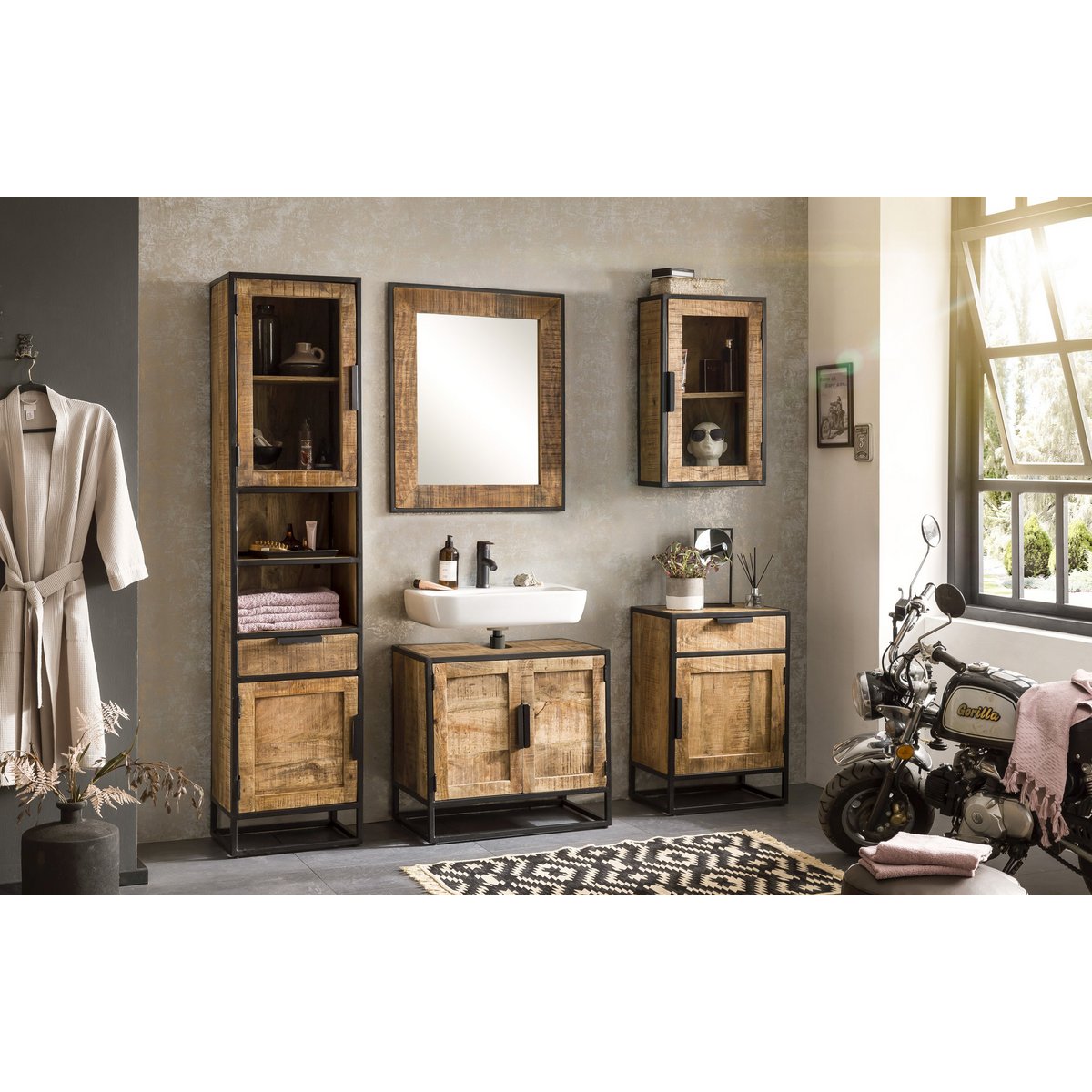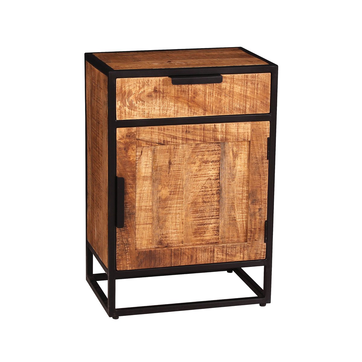 Diese kleine Kommode aus naturfarbigem Mangoholz mit trendigem schwarzen Kufengestell ist eine Bereicherung in jedem Ambiente. Hinter der Tür und in der Schublade ist Platz für Ihre persönlichen Dinge. Der Materialmix von rustikalem Holz in warmem Naturton und glattem Metall liegt voll im Trend, sorgt für interessante Kontraste in der Optik und schafft eine wohnliche Atmosphäre. Die Kommode ist zudem sehr vielseitig in allen möglichen Räumen verwendbar. Rahmen aus schwarzem Metall, 1 Boden.