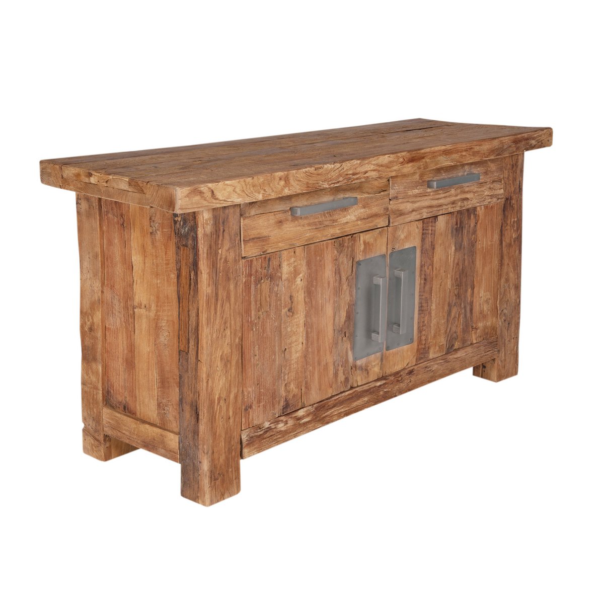 Ein attraktiver Blickfang ins Wohnzimmer ist diese Kommode aus recyceltem Teak. Sie punktet mit einem Mix aus recyceltem Holz in warmem Naturton und Metallgriffen. Der Materialmix von warmem Holz und derben Metall liegt voll im Trend und sorgt für interessante Kontraste in der Optik. Neben ihrer Optik überzeugt sie mit fühlbarer Struktur. Die Kommode lässt sich harmonisch in verschiedene Wohnprogramme integrieren. Hinter zwei Türen und zwei Schubladen verbirgt sich jede Menge geschlossener Stauraum, in dem Alltagsgegenstände, die man gerne verstecken möchte Platz finden. Gefertigt wird die Kommode aus wiederverarbeitetem Holz alter Scheunen und Häuser - jedes Stück ist ein Unikat. Sorgt für eine wohnliche Atmosphäre: Die Kommode mit modernem Materialmix. Schubladenschienen aus Holz.