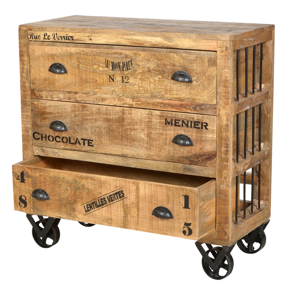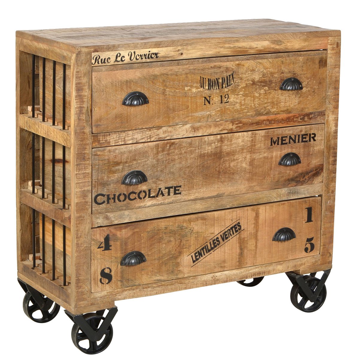Die Kombination aus lackiertem Mangoholz und Metallbeschlägen in Antikschwarz verleihen der Kommode ihren rustikalen Charme. Das verwendete Holz stammt von alten Scheunen, Häusern und Reiströgen und ist besonders stark und widerstandsfähig. Durch die naturgemachte Witterung entsteht ein besonders warmer Farbton, der jeden Raum im Handumdrehen gemütlich macht. In drei Schubladen bietet die Kommode jede Menge Stauraum, in denen z.B. Papiere und Kleinigkeiten Platz finden. Abgerundet wird der industrielle Look durch schwarze Aufdrucke, die an Transport- und Lagerkisten erinnern. Die handgeschmiedeten Rollen und Beschläge passen ideal in die industrielle Themenwelt, die diese Möbelserie erzählt. Durch die Rollen steht die Kommode leicht erhöht, was für einen luftig-leichten Look sorgt. Dank der natürlichen Optik des Mangoholzes kann die Kommode in vielen Wohnstilen – z.B. in Wohnzimmer, Schlafzimmer oder Büro – eingesetzt werden. Schubladeninnenmaße 44,3x32x13,5 cm.