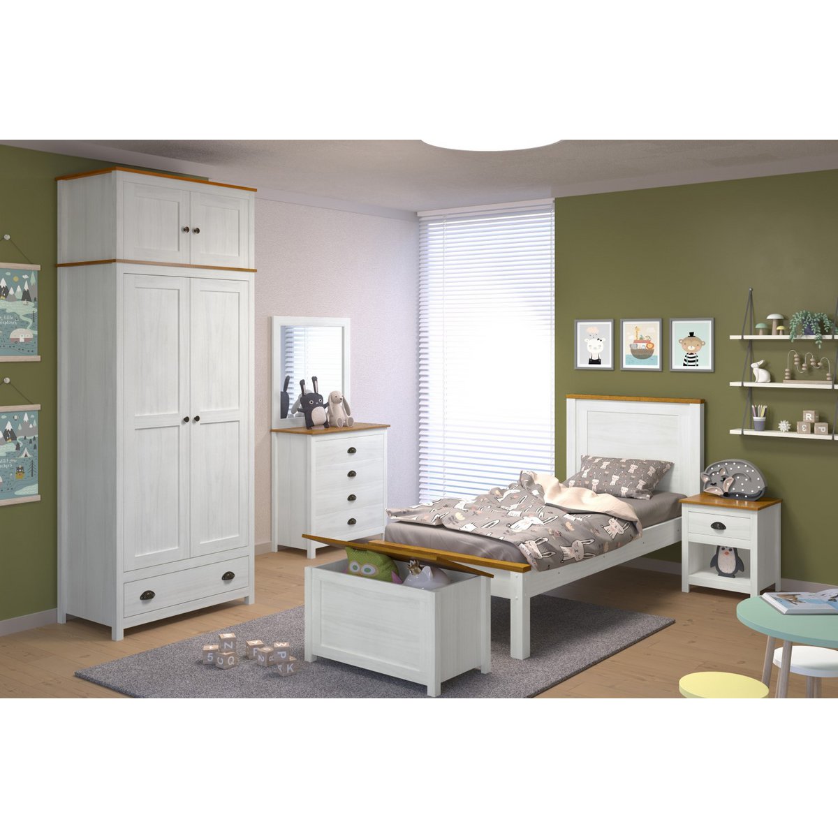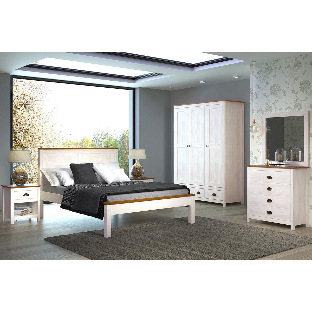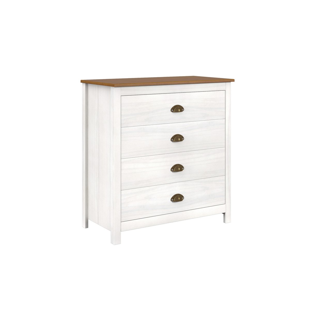 Diese funktionale Kommode im zeitlosen Landhausstil bietet mit 4 Schubladen mit Metallauszügen jede Menge Stauraum. So schaffen Sie spielend leicht Ordnung in Wohn- und Schlafzimmer oder dem Eingangsbereich. Die rustikale weiße Lackierung des Korpus verleiht der Kommode einen besonders charakteristischen Look. Gefertigt aus massivem Kiefernholz ist die Kommode besonders robust. Optisch abgerundet wird das Kastenmöbel mit einer braunen Deckplatte und messingfarbenen Muschelgriffen. Wer den urig gemütlichen Landhausstil mag und sein Hab und gut gerne gut verstaut weiß, der trifft mit dieser praktischen Kommode die richtige Wahl. Schubladen mit Metallauszügen, Fußmaterial Pinie