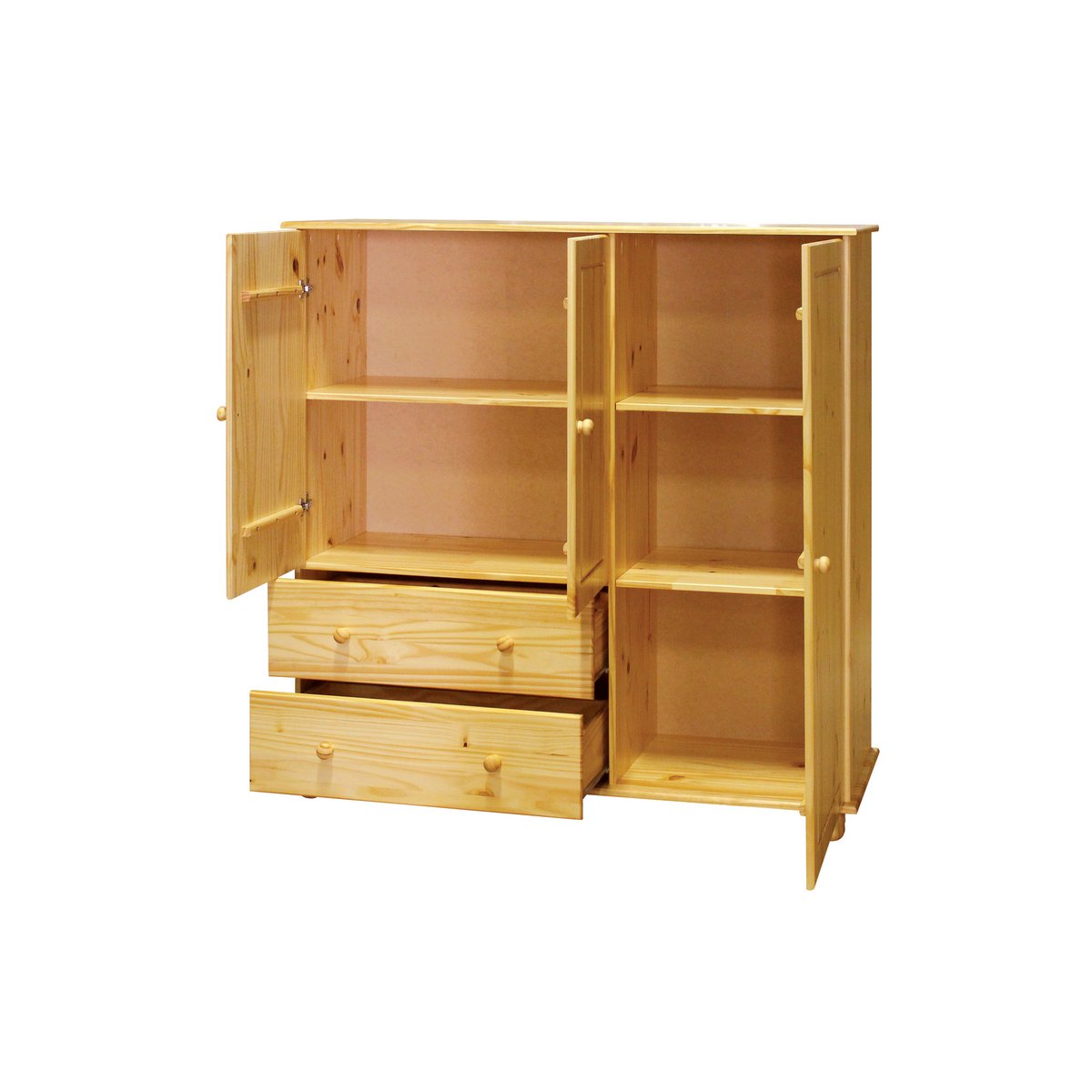 Unsere Kommode aus massivem Kiefernholz ist nicht nur ein praktisches Möbelstück, sondern auch ein stilvoller Blickfang für Ihr Zuhause. Mit ihrer intelligenten Aufteilung bietet sie nicht nur reichlich Stauraum, sondern auch flexible Organisationsmöglichkeiten. Das Besondere an dieser Kommode ist ihre clevere Aufteilung in zwei Teile: Der schmalere Teil verfügt über eine Tür und zwei variable Einlegeböden. Der breitere Teil ist mit zwei Türen und einem variablen Einlegeboden ausgestattet, der Ihnen zusätzlichen Stauraum für Kleidung, Bettwäsche oder andere größere Gegenstände bietet. Zusätzlich bieten die zwei Schubladen mit Metallführungen eine praktische Aufbewahrungsmöglichkeit für kleinere Gegenstände. Gefertigt aus hochwertigem Kiefernholz und natur lackiert, besticht diese Kommode durch ihre natürliche Schönheit und Robustheit. Die lackierte Oberfläche schützt das Holz vor Abnutzung und erleichtert die Pflege, wodurch die Kommode besonders langlebig ist. Kommode in 2 Teile geteilt, im schmaleren Teil 1 Tür und 2 variable Einlegeböden, im breiteren Teil 2 Türen mit 1 variablen Einlegeboden, 2 Schubladen mit Metallführungen