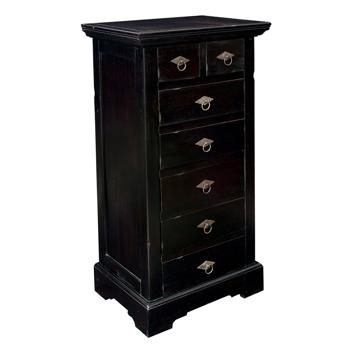 Diese Kommode aus massiver Akazie in dem Farbton Antikfinish ist ein echter Blickfang. Das antike Flair lässt es zu, dass dieses Möbel sich problemlos in modernes Mobiliar integrieren lässt, so ist es gerade für den Landhausstil wie gemacht - als zusätzlichen Dielenschrank, im Esszimmer oder Wohnbereich als Beistellkommode. Gewollte Gebrauchsspuren geben dem fast schwarzen Holz einen zusätzlichen Reiz. Die Deckplatte eignet sich für diverse Dekorationsmöglichkeiten und lässt die Schönheit der antik anmutend wirkenden Konsole erst zur Geltung kommen. In 2 kleinen und 5 großen Schubladen findet sich ausreichend Stauraum für die kleinen Dinge des Alltags. Schubladeninnenmaße groß: 32x22,5x9 cm, klein: 13x22,5x9 cm.