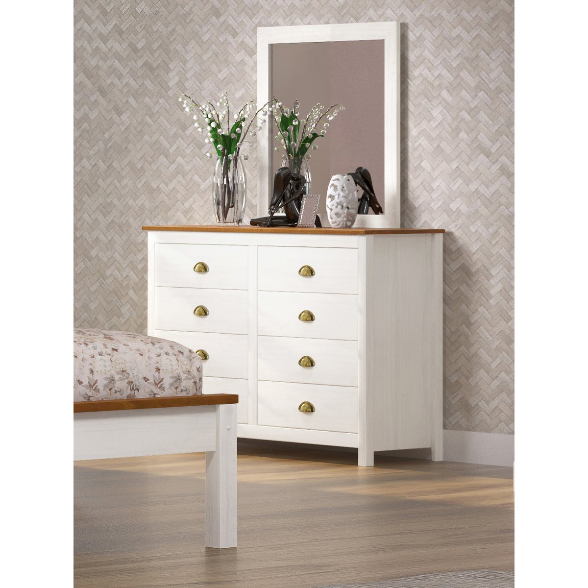 Diese Kommode ist ein solides und hochwertiges Produkt aus massiver Kiefer. Die Kommode ist weiß lackiert mit brauner Deckplatte abgesetzt. In 8 Schubladen auf Metallauszügen und mit Metallgriffen bietet sie Platz für Wäsche, Handschuhe oder sonstige Dinge. Schubladen mit Metallauszügen, Fußmaterial Pinie, Schubladeninnenmaße (BxTxH) 49,5 x 33,5 x 9 cm