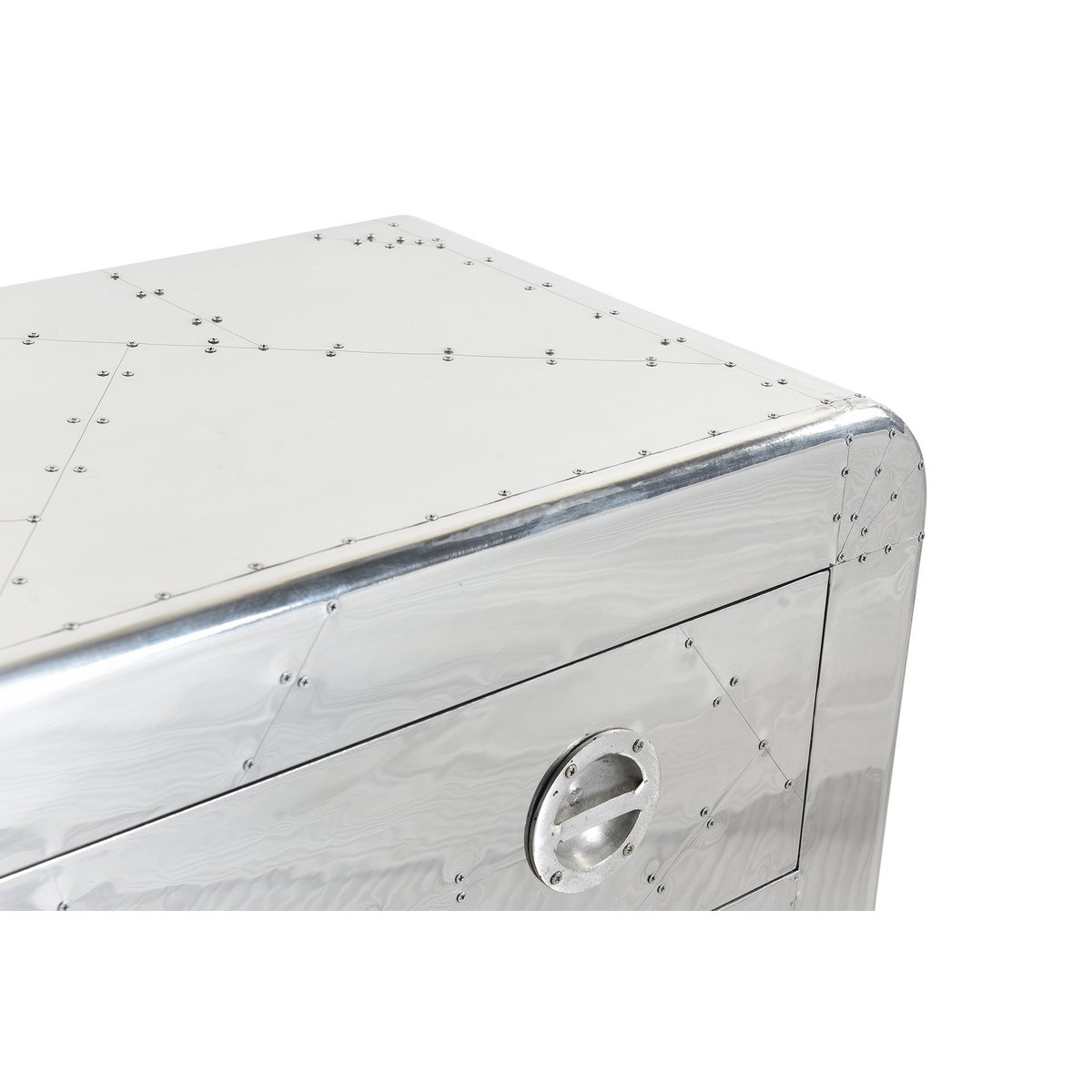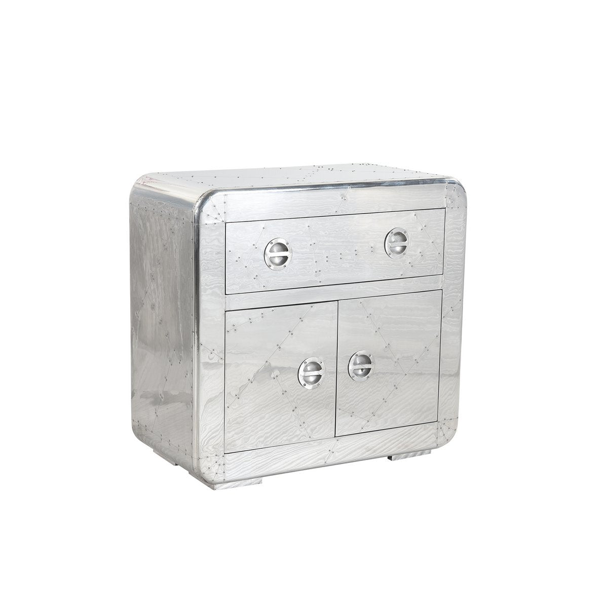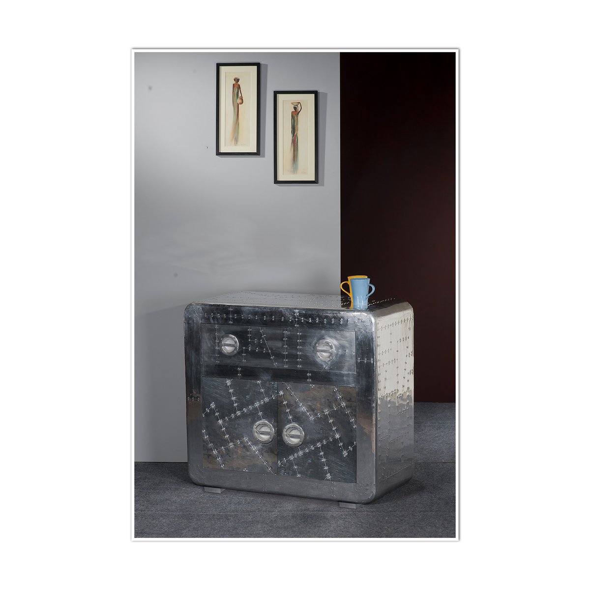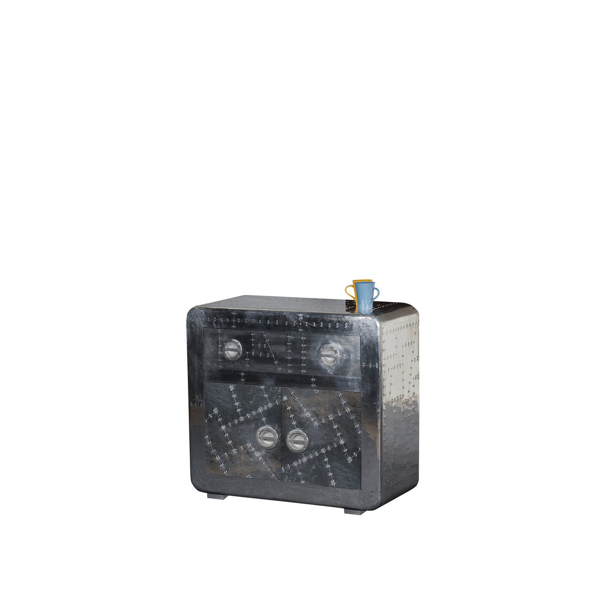 Hier werden den Themen VINTAGE und FACTORY DESIGN besonders gehuldigt. Inspiriert von den Pionieren der Luftfahrt werden diese Möbel von Hand mit Alu belegt und mit unzähligen Schrauben zu einzigarten Objekten, die sich wohltuend von der Masse abheben. Schubladenführungen und Beschläge aus Metall halten den Belastungen des Alltags stand. Eine Schublade und 2 Türen erhöhen den praktischen Nutzen. Kein Boden, Fachmaß 65x37x39 cm, Schubladeninnenmaß 65x32x15 cm.