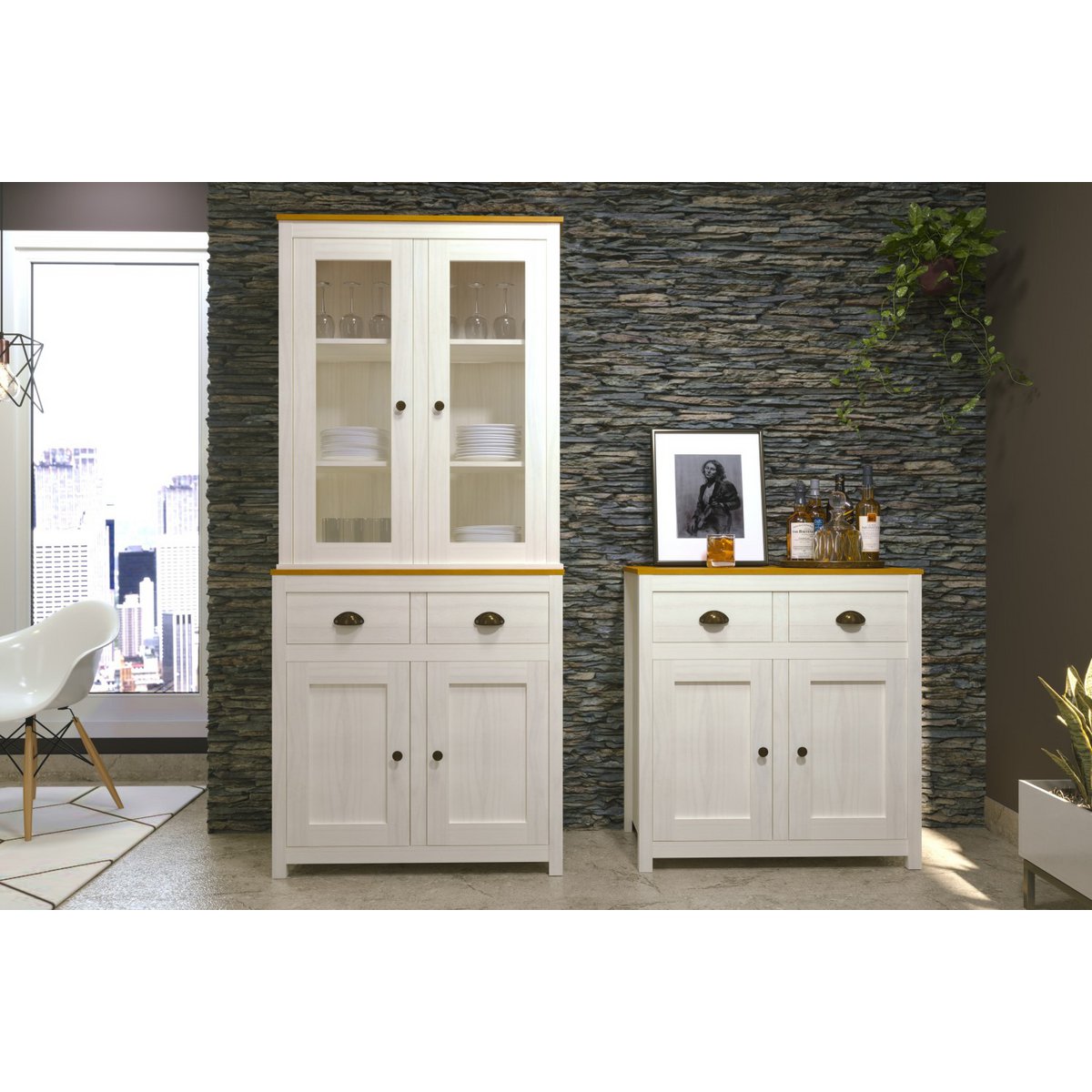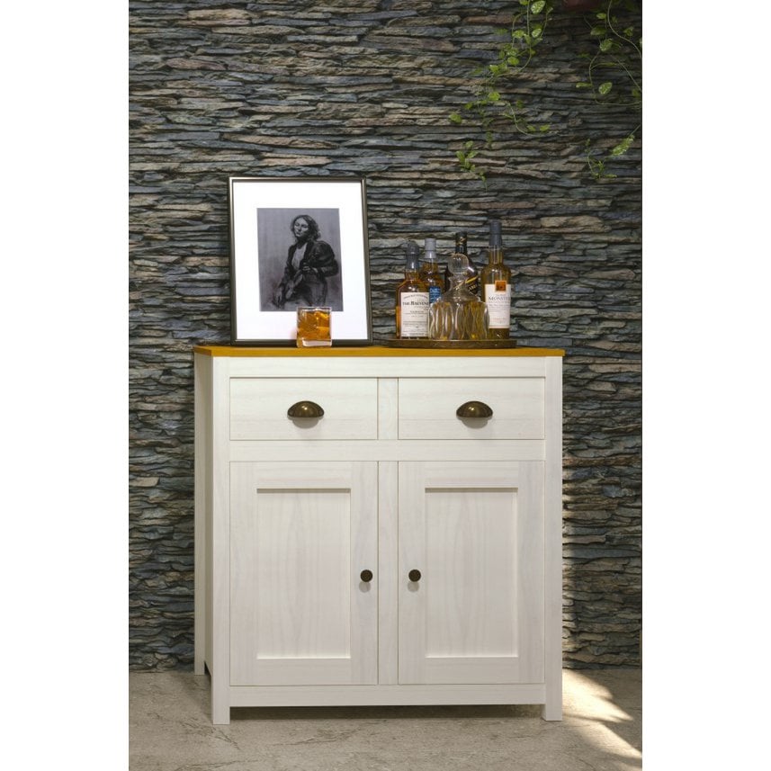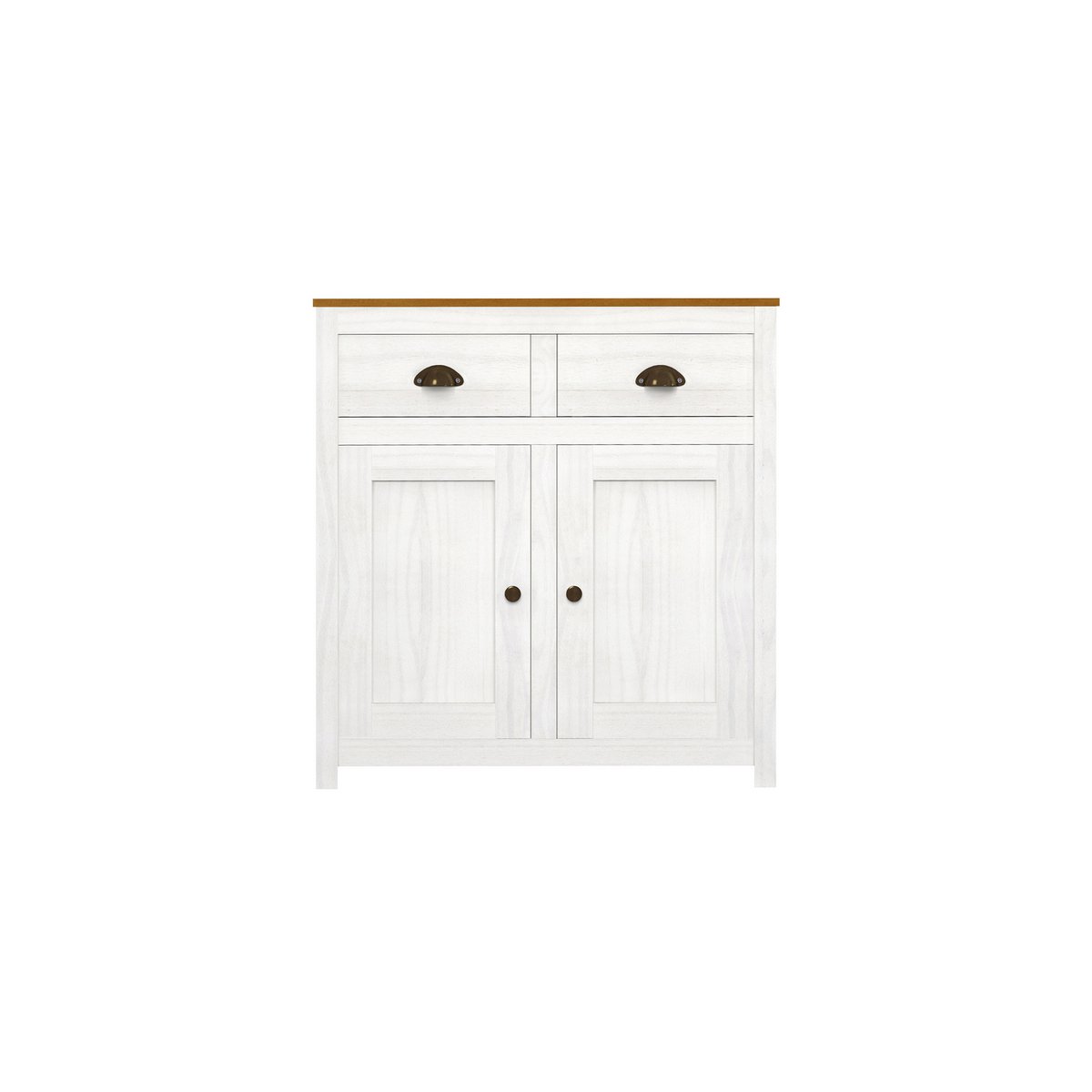 Diese funktionale Kommode im zeitlosen Landhausstil bietet mit 2 Türen und 2 Schubladen mit Metallauszügen jede Menge Stauraum. So schaffen Sie spielend leicht Ordnung in Wohn- und Schlafzimmer oder dem Eingangsbereich. Die rustikale weiße Lackierung des Korpus verleiht der Kommode einen besonders charakteristischen Look. Gefertigt aus massivem Kiefernholz ist die Kommode besonders robust. Optisch abgerundet wird das Kastenmöbel mit einer braunen Deckplatte und messingfarbenen Muschelgriffen. Wer den urig gemütlichen Landhausstil mag und sein Hab und Gut gerne gut verstaut weiß, der trifft mit dieser praktischen Kommode die richtige Wahl. Schubladen mit Metallauszügen, Fußmaterial Pinie