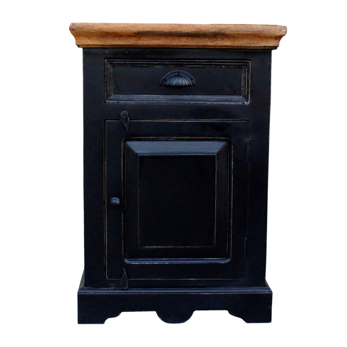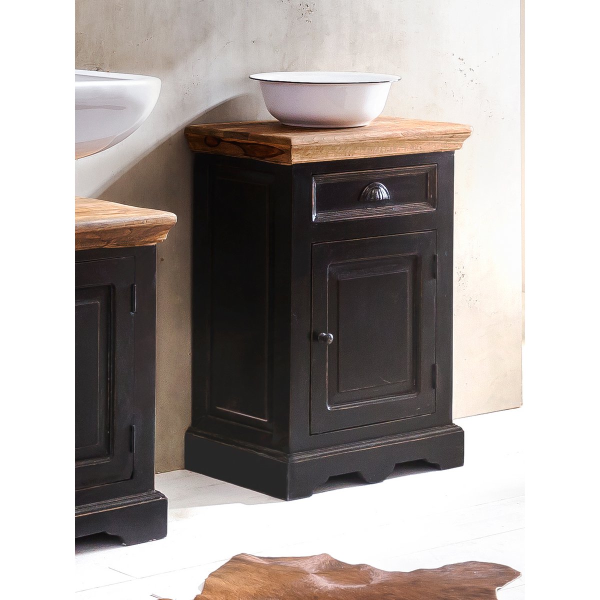 Dieser Badschrank wirkt in jedem Badezimmer sehr edel. Ausgestattet mit 1 Tür und einem Schubkasten bietet der Schrank ausreichend Stauraum für Kosmetika, Handtücher und weitere Accessoires. Die honigfarbene Deckplatte des Badezimmerschranks lädt zum Dekorieren ein oder - je nach Platzanspruch - auch als weitere Ablagefläche. Die Neutralität seiner Erscheinung lässt es zu, dass man ihn durchaus auch als kleinen Dielenschrank oder Garderobenschrank oder sogar als Nachtkommode verwenden kann. Hier sind der Fantasie keine Grenzen gesetzt, denn das schwarze Holz aus Mango lässt sich hervorragend mit modernen Möbeln kombinieren. Türanschlag wählbar.
