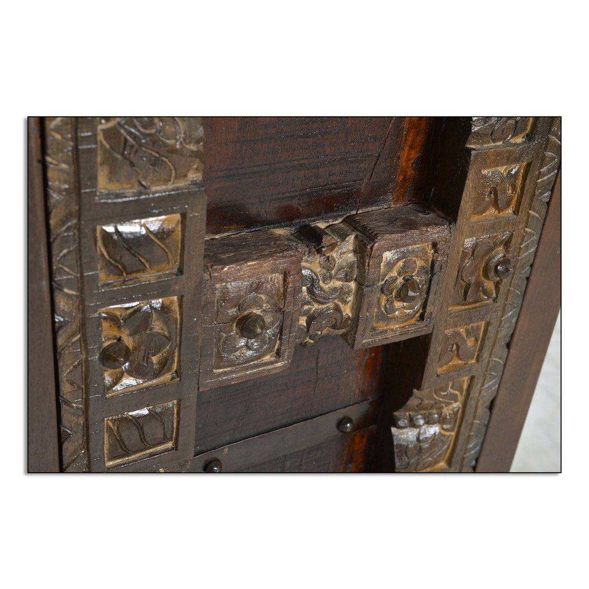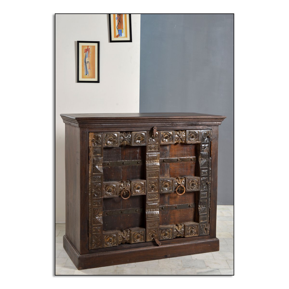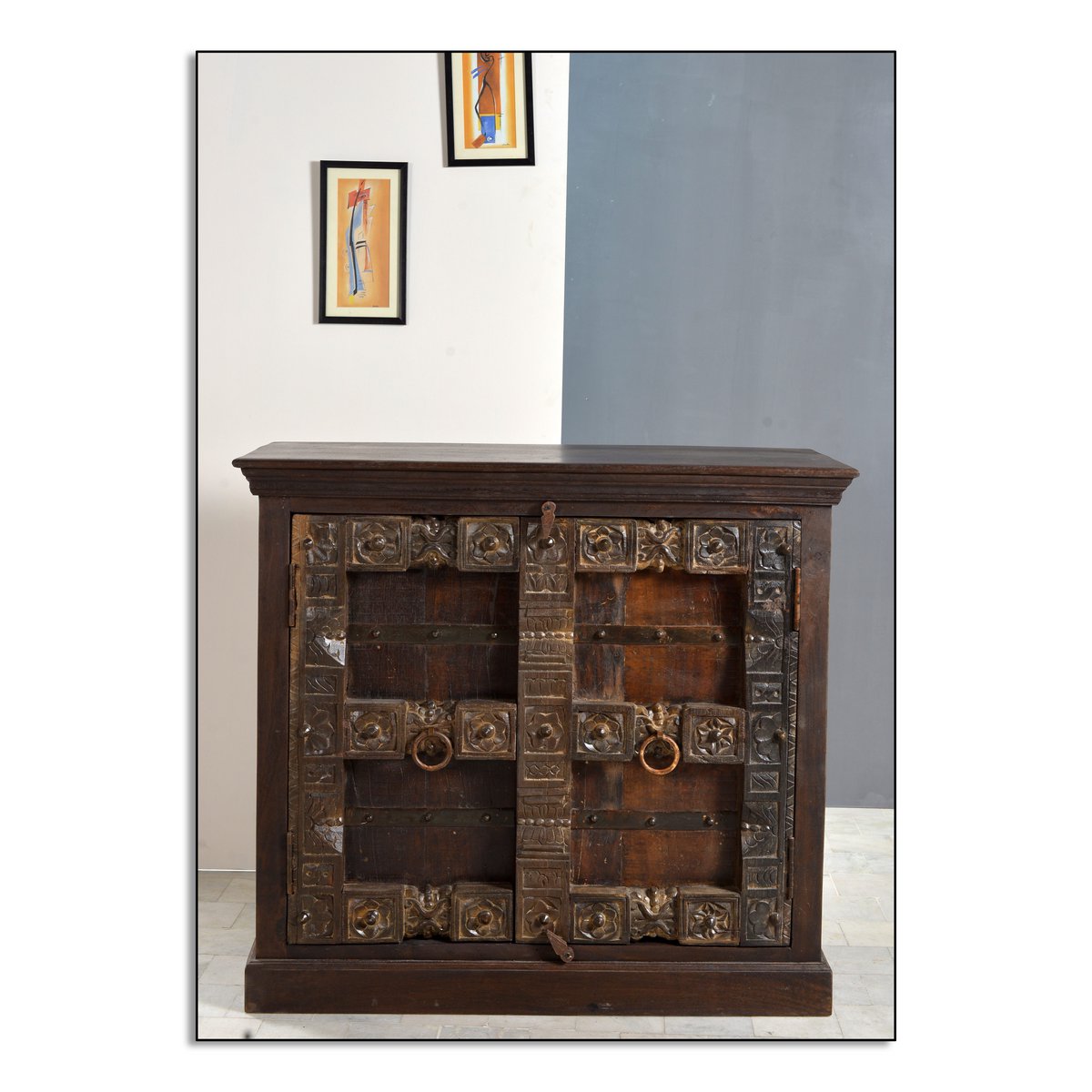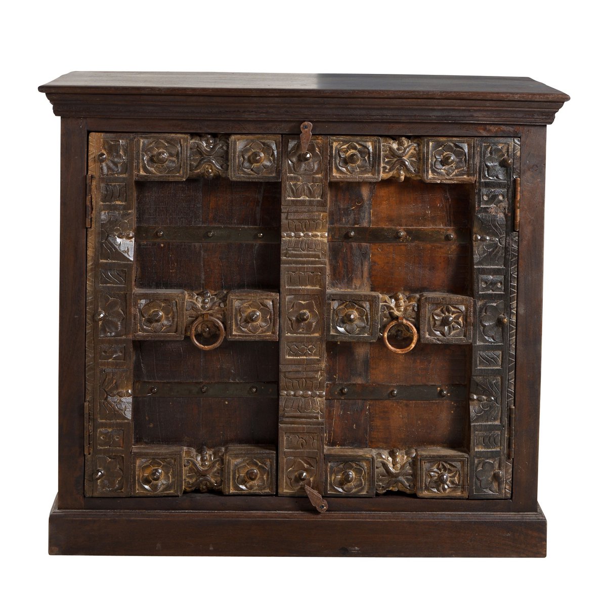 Eine Kommode, welches Ihnen das Gefühl gibt, Ferien in Indien zu erleben. Aufwändige Schnitzereien auf recyceltem Altholz mit Metallapplikationen geben der Front der Anrichte den für Indien typisch antik kolonialen Look. Der halbhohe Schrank bietet genügend Stauraum hinter 2 Türen für vielerlei Dinge. Die Deckplatte eignet sich auch für größere Vasen und lässt die Schönheit des antik kolonialen anmutenden Buffets erst zur Geltung kommen. Gewollte Gebrauchsspuren geben dem Kommodenschrank einen zusätzlichen Reiz. Die Kommode kann sowohl in einem Wohnraum mit modernem Mobiliar kombiniert werden als auch in einer Diele als Dielenschrank ihren Charme zum Ausdruck bringen. 1 Boden.