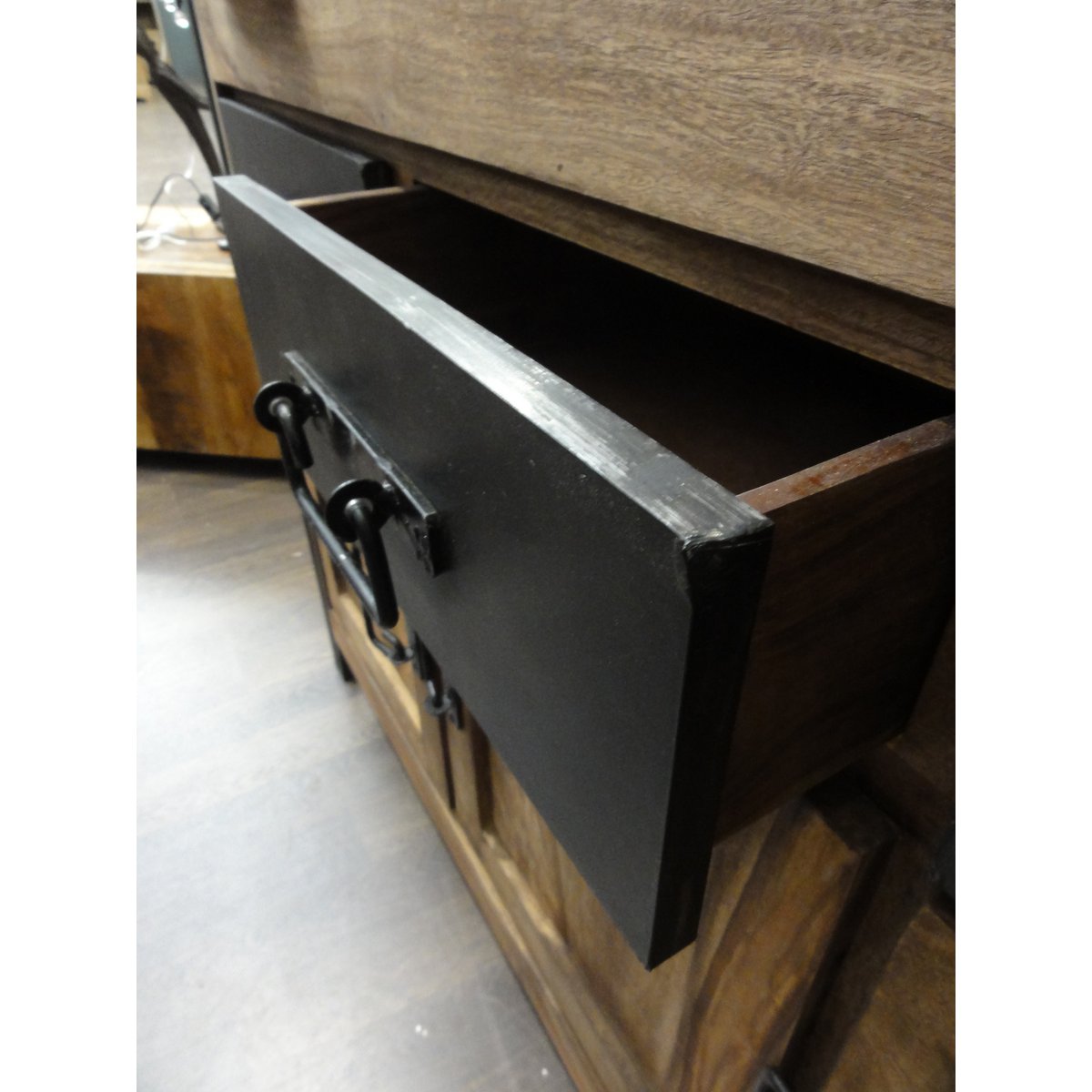 Massives Akazienholz trifft auf industrielle Metallbeschläge bei dieser kompakten Kommode. Auf einer Breite von 100 cm finden Sie genügend Platz. In zwei Schubladen und hinter zwei Türen erhalten Sie Stauraum für Alltägliches. Der Holzkorpus aus Akazie mit starken Gebrauchsspuren ist eingefasst von einem modernen Metallgestell. Die industrielle Optik wird von Metallaufsätzen an Schubladen und Griffen fortgeführt und macht diese Kommode zu einem originellen Hingucker. Die Struktur des Holzes variiert von Modell zu Modell, so dass jedes Board zum Unikat mit eigenem Charme wird. Ob als Hingucker in schlichtem Ambiente oder als Teil einer modernen Einrichtung im Factory Design, diese Kommode ist eine schicke Ergänzung für viele Wohnstile. Der moderne Materialmix verbindet dabei Shabby- und Industrial Look. 1 durchgehender, fester Boden, Fachinnenmaße BT 87x36 cm, unten 32 cm, oben 26 cm, Schubladen innen: 37x29x10 cm, Materialstärke 15 mm, Belastbarkeit der Böden 40 kg, Gesamtbelastbarkeit 100 kg, 10 cm zwischen Unterkante und Boden.
