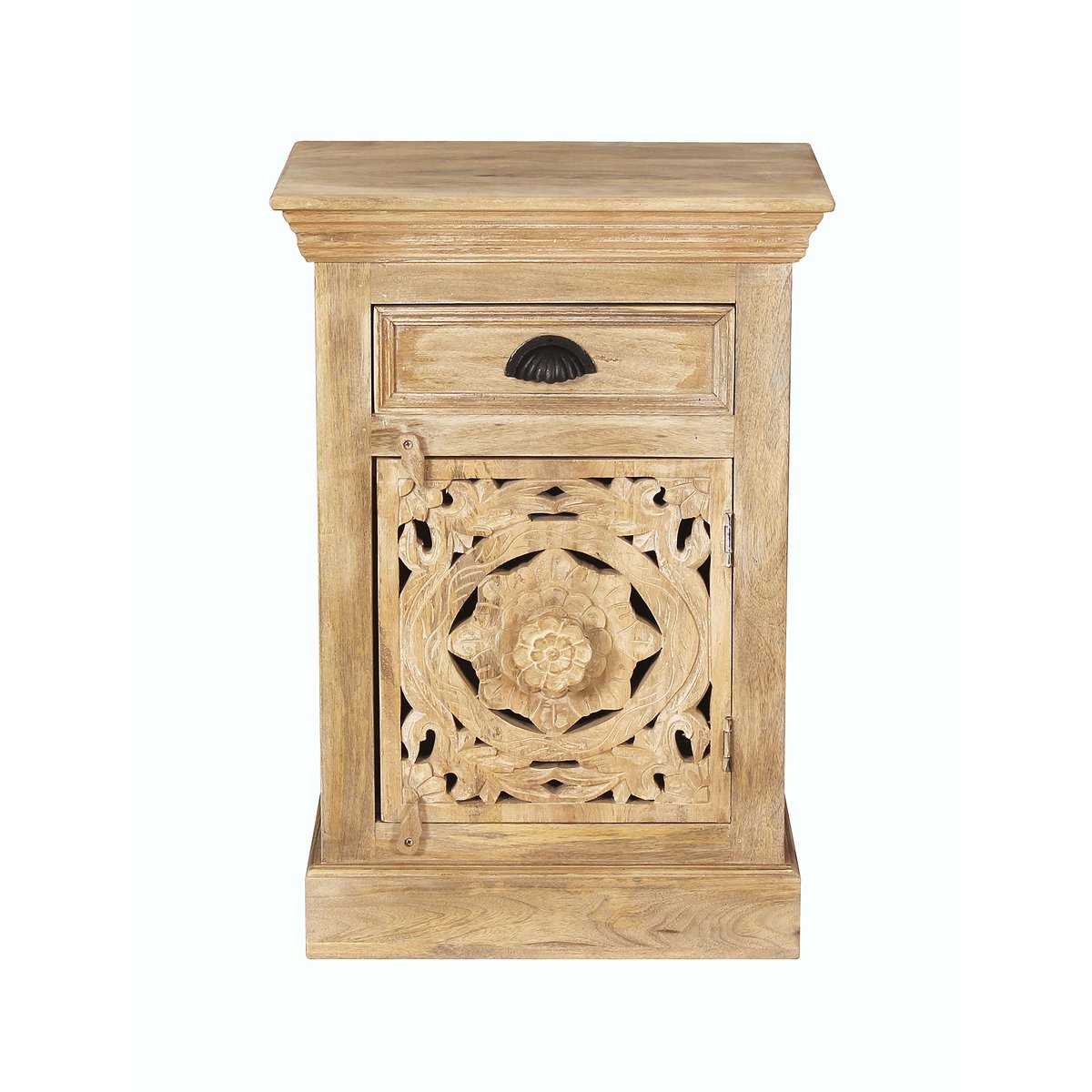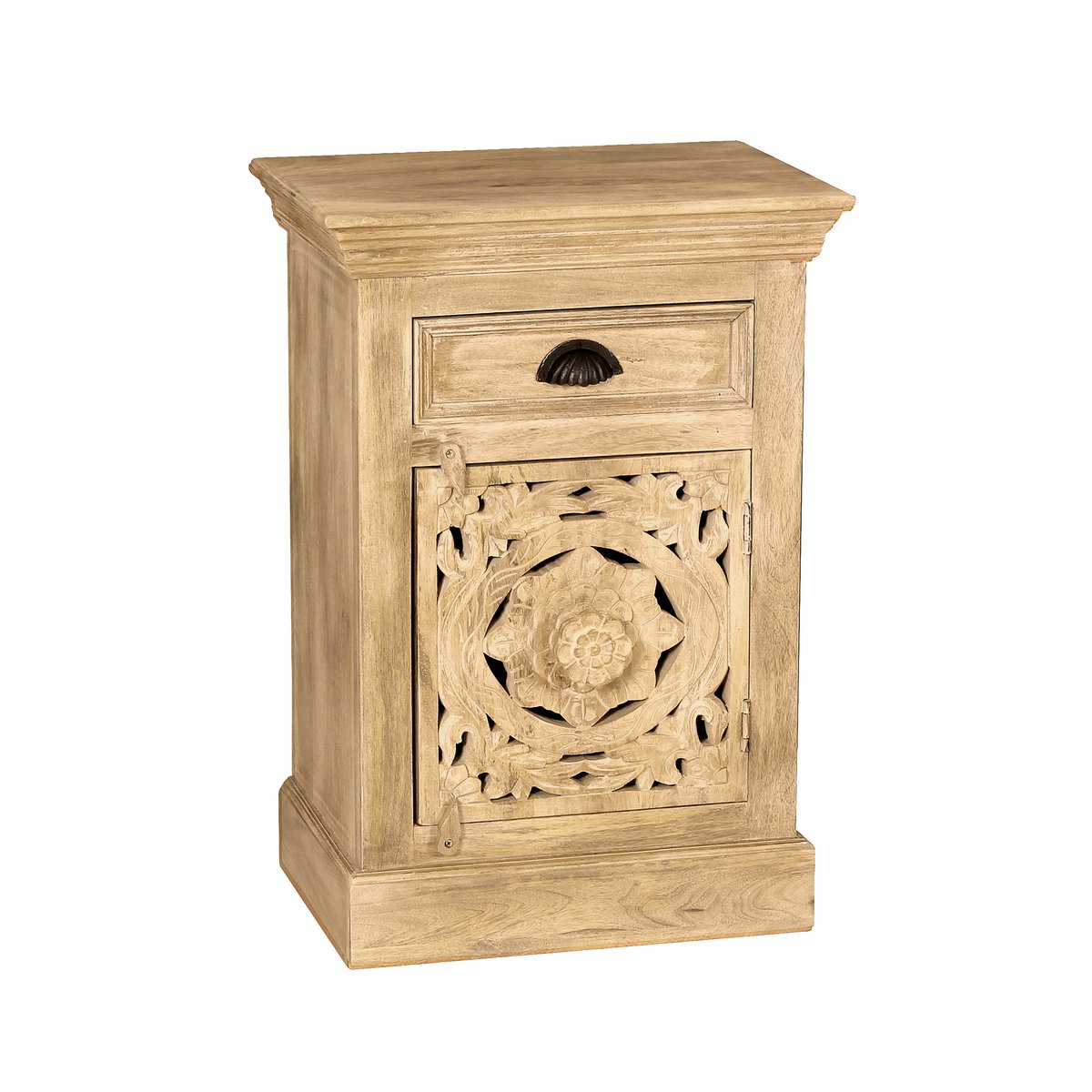 Diese Kommode aus Mangoholz in einem hellen Naturton wertet Ihre Räumlichkeiten auf. Die Kommode bietet hinter einer Tür und in einer Schublade genügend Stauraum für vielerlei Dinge. Auf dem Schrank können Sie ein paar Dekoartikel, Pflanzen oder Bilder abstellen. Die Kommode lässt sich problemlos in fast jedes Zimmer integrieren. Die aufwändigen Schnitzereien an der Front machen dieses Schränkchen zu einem absoluten Hingucker, um den Ihre Freunde sie beneiden werden. Jedes Teil ist ein Einzelstück von Wert. Mit Muschelgriff und aufwändigen Schnitzereien, Innenabmeßung: 39,5 x 28 cm, Schubladeninnenabmeßung: 29,5 x 22,5 x 8,7 cm