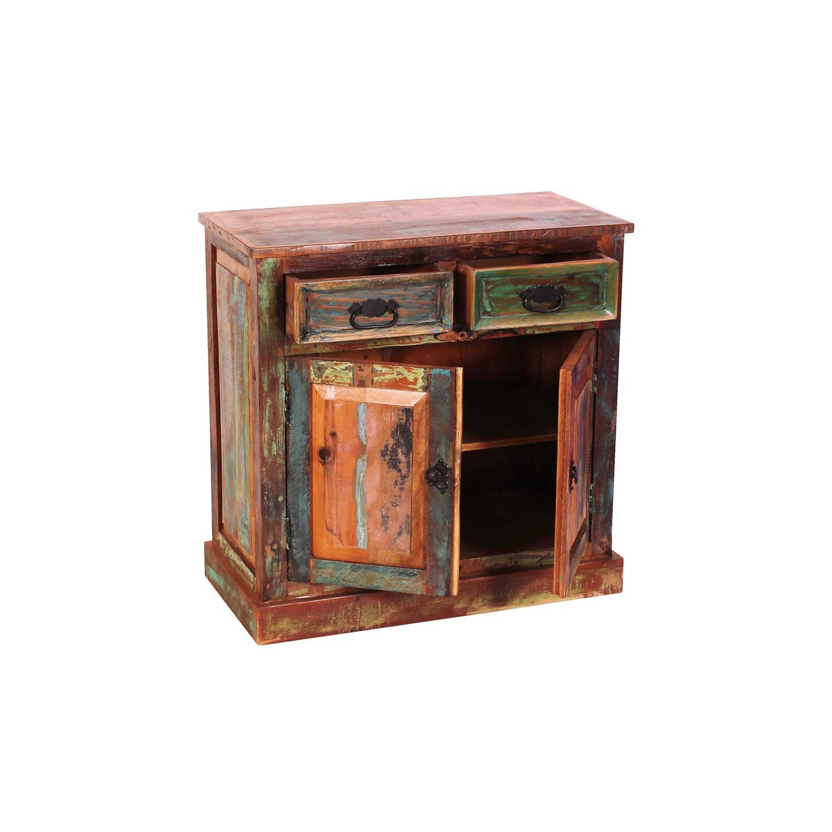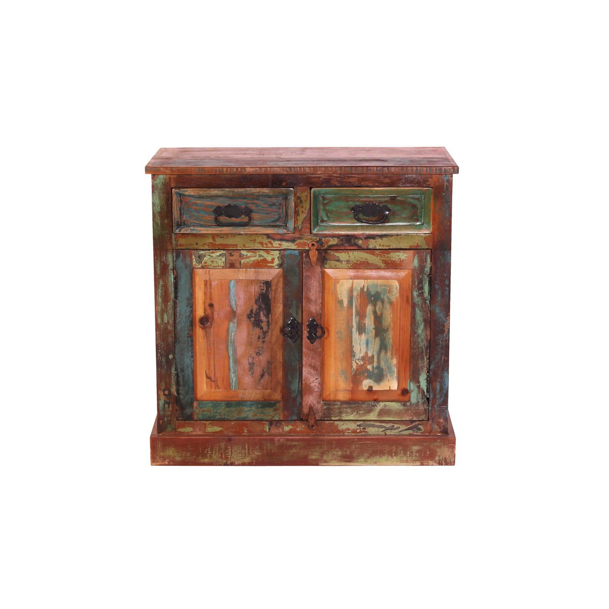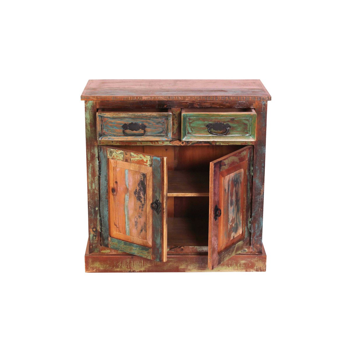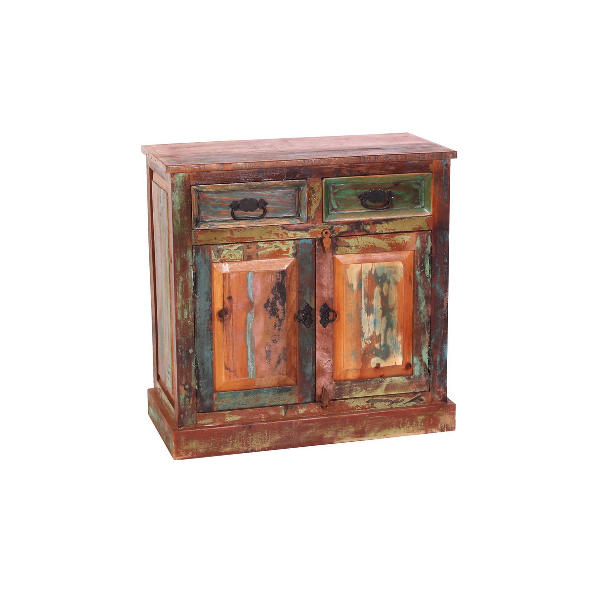 Diese Kommode gefertigt aus buntem Altholz im Shabby Chic, ist ein wahrer Eyecatcher. Sie ist dank ihrer Kombinationsmöglichkeit mit schon vorhandenem Mobiliar vielseitig einsetzbar. Das Schränkchen bietet genügend Platz in 2 Schubkästen und hinter 2 blickdichten Türen mit je einem festen Einlegeboden für die privaten Dinge des Lebens. Die Deckplatte eignet sich auch für größere Vasen oder Schalen. In Flur als zusätzlicher Garderobenschrank bietet er viel Stauraum. Das Holz aus recycelten Fischerbooten gibt dem Kommodenschrank einen zusätzlichen Reiz. Die Kommode kann sowohl in einem Wohnraum oder Esszimmer mit modernem Mobiliar kombiniert werden als auch in einer Diele als Dielenschrank ihren Charme zum Ausdruck bringen. Fernab von unserer oft langweiligen Perfektion, ist dieses Möbel ein echtes Unikat. Hergestellt aus FSC-zertifiziertem Holz. 1 Boden.