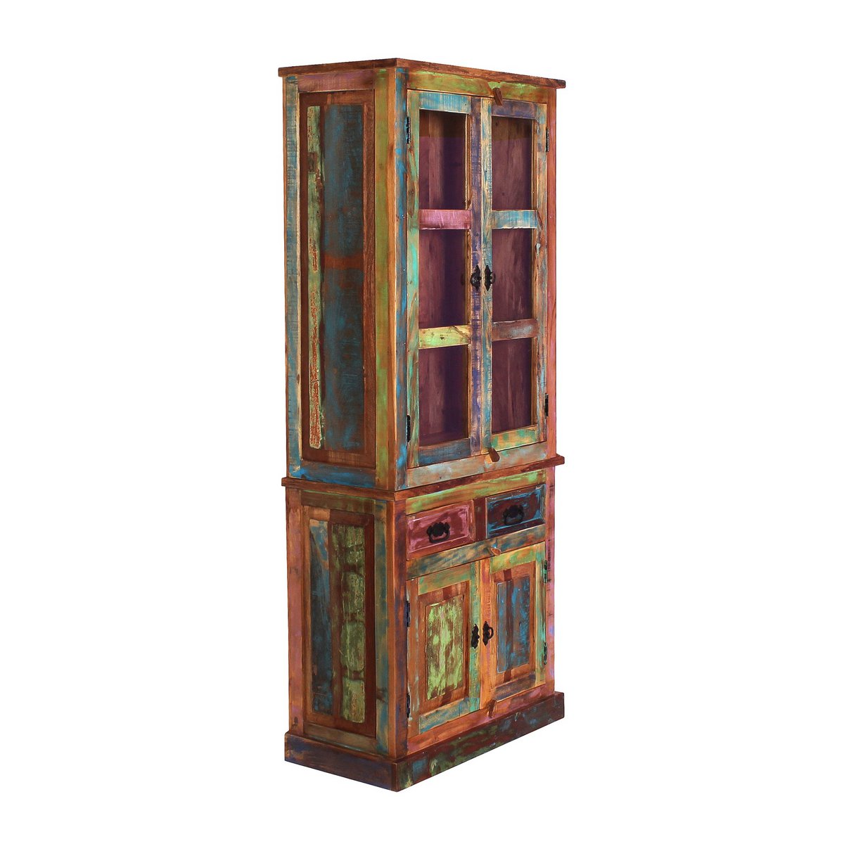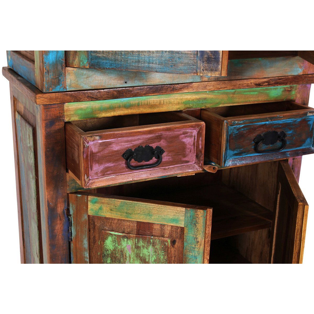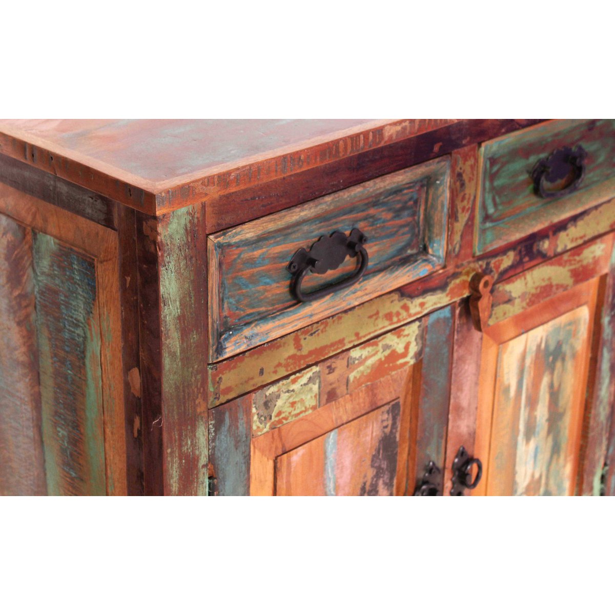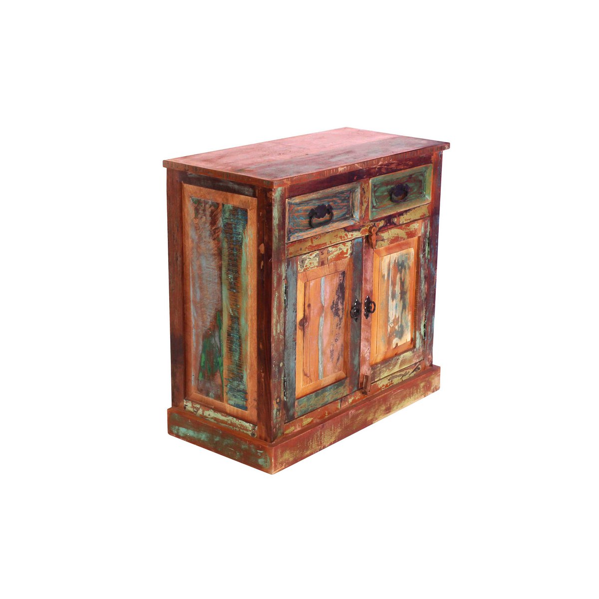 Diese Kommode gefertigt aus buntem Altholz im Shabby Chic, ist ein wahrer Eyecatcher. Sie ist dank ihrer Kombinationsmöglichkeit mit schon vorhandenem Mobiliar vielseitig einsetzbar. Das Schränkchen bietet genügend Platz in 2 Schubkästen und hinter 2 blickdichten Türen mit je einem festen Einlegeboden für die privaten Dinge des Lebens. Die Deckplatte eignet sich auch für größere Vasen oder Schalen. In Flur als zusätzlicher Garderobenschrank bietet er viel Stauraum. Das Holz aus recycelten Fischerbooten gibt dem Kommodenschrank einen zusätzlichen Reiz. Die Kommode kann sowohl in einem Wohnraum oder Esszimmer mit modernem Mobiliar kombiniert werden als auch in einer Diele als Dielenschrank ihren Charme zum Ausdruck bringen. Fernab von unserer oft langweiligen Perfektion, ist dieses Möbel ein echtes Unikat. Hergestellt aus FSC-zertifiziertem Holz. 1 Boden.