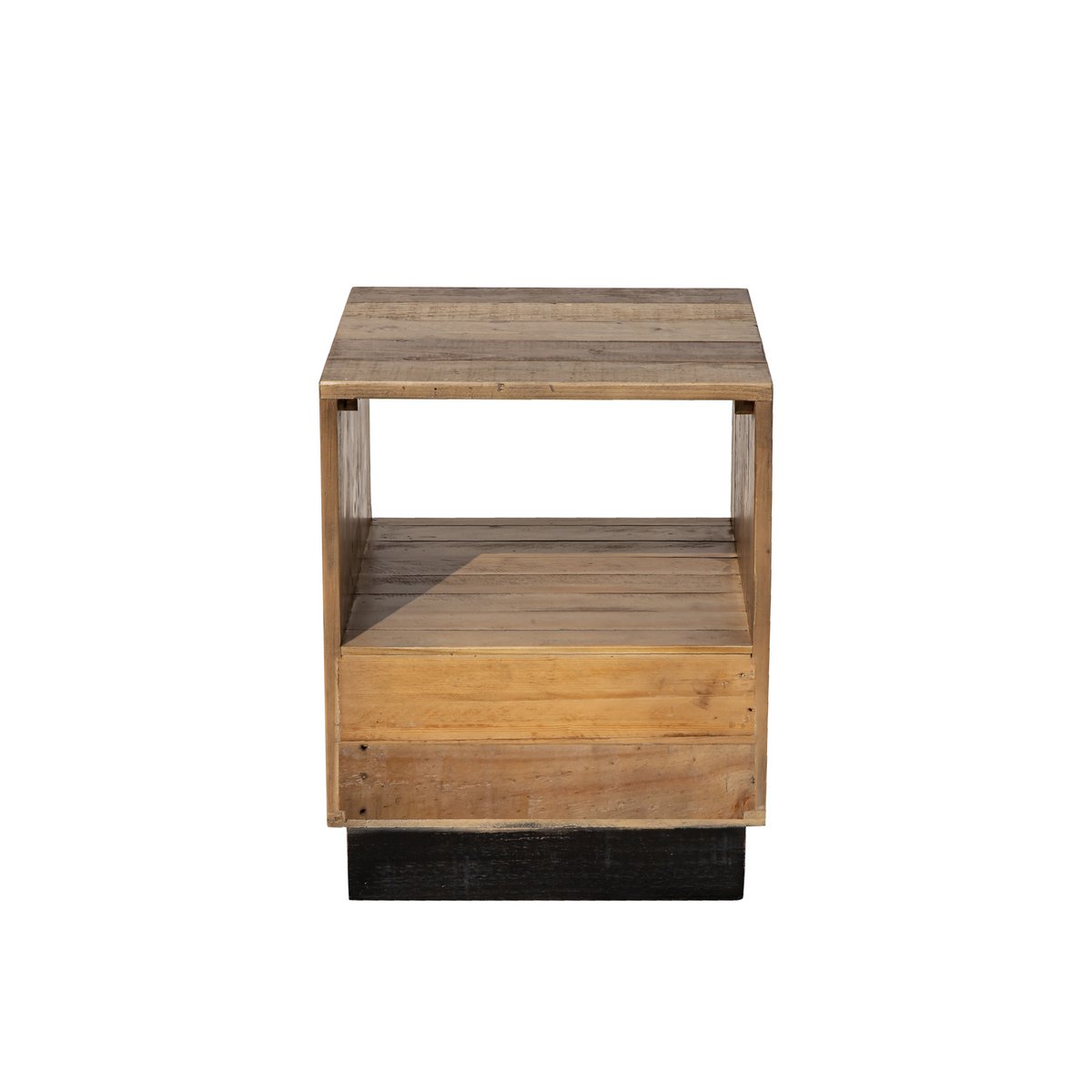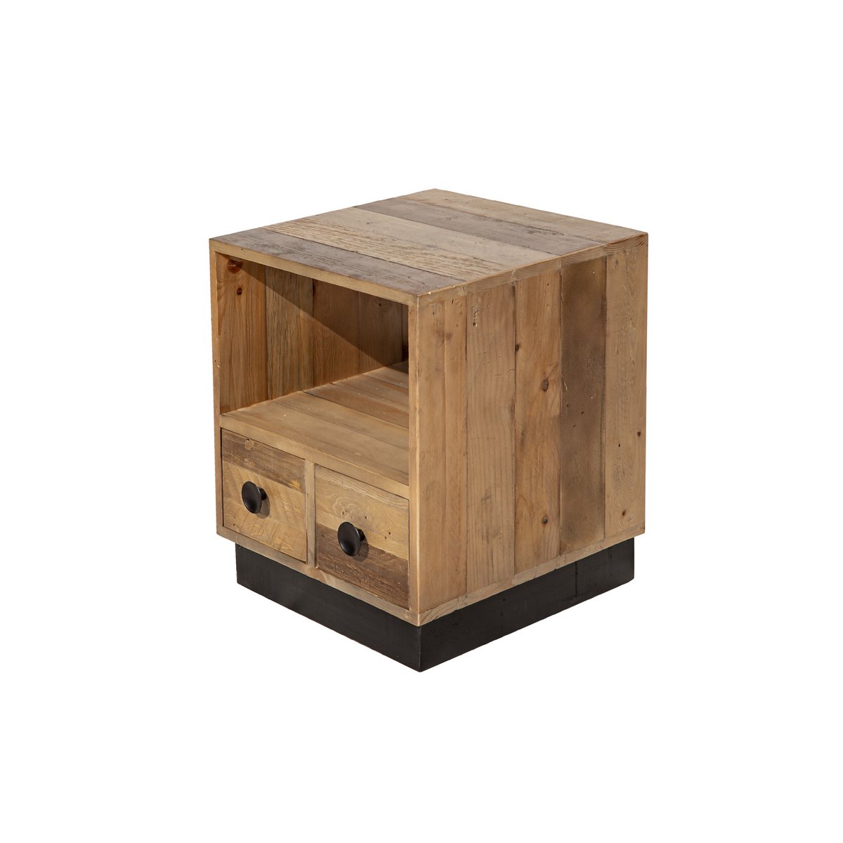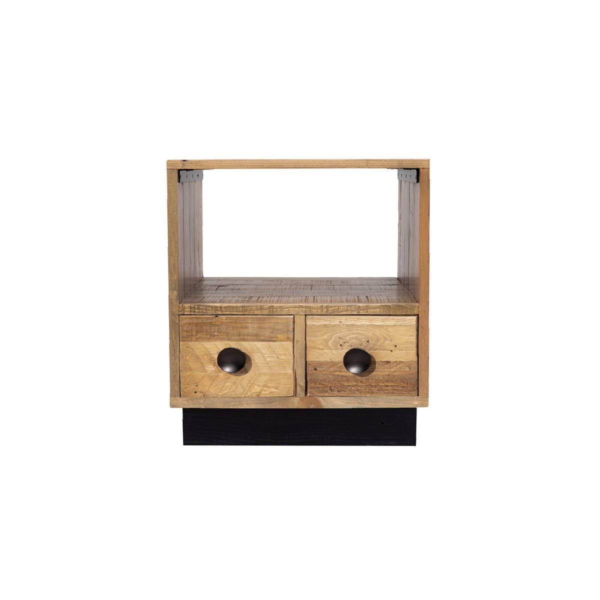 Ein attraktiver Blickfang in jedem Wohnraum ist diese Nachtkommode aus recyceltem Pinienholz. Der Nachtschrank punktet mit einem Materialmix von Holz in warmem Naturton und derben Metallgriffen. Dies liegt voll im Trend und sorgt für interessante Kontraste in der Optik. Neben ihrer Optik überzeugt diese Kommode mit fühlbarer Struktur. Die Nachtkonsole lässt sich harmonisch in verschiedene Wohnprogramme integrieren. Zwei Schubladen und ein offenes Fach sorgen für zusätzlichen Stauraum. Hier können Zeitschriften, Bücher oder dergleichen abgelegt werden. Auch für eine Nachttischlampe ist hier genügend Platz. Das kleine Schränkchen kann auch als Beistelltisch neben einem Sofa verwendet werden. Fachmaß 41x25x45 cm