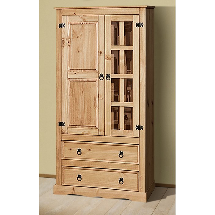 Diese zeitlose Vitrine ist aus massiver Kiefer im rustikalen Stil gefertigt. Die Oberfläche ist in einem warmen Honigton gewachst. Die Kommode bietet in 2 Schubkästen und hinter 2 Türen mit insgesamt 5 Einlegeböden viel Stauraum. Die Sockelleiste hat eine geschwungene Form. Dias Massivholzmöbel ist ein absoluter Hingucker für Ihr Wohn- und Esszimmer. Die schwarz lackierten Metallverzierungen geben dieser Vitrine das gewisse Extra. 5 Böden hinter den Türen, Schubladeninnenmaße (BxTxH) 80 x 31,5 x 17 cm