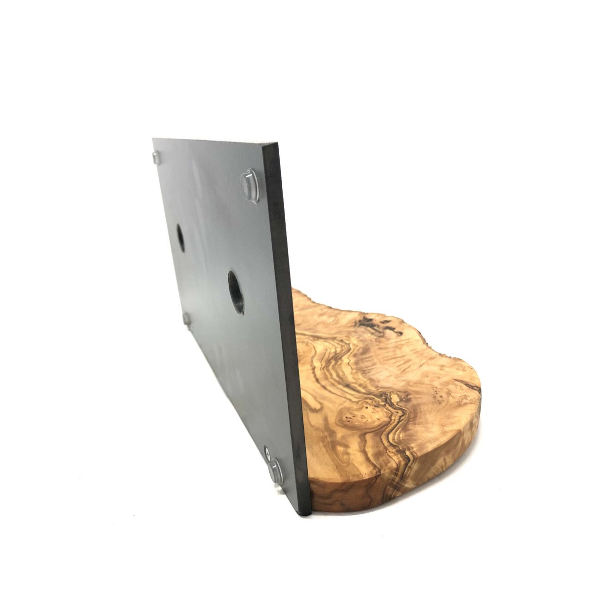 Zwei weiße Porzellanschalen je 0,4 Liter als Futternapf, auf einer schwarzen, extrem unempfindlichen Platte (30 x 18 cm). Der Clou: Als Spritzschutz ist ein rustikal massives Brett aus Olivenholz fixiert. Durch den natürlich rustikalen Rand ähnelt es in dieser Kombination einem Berg.