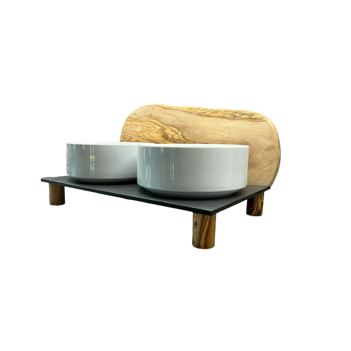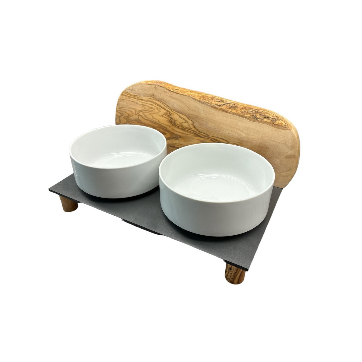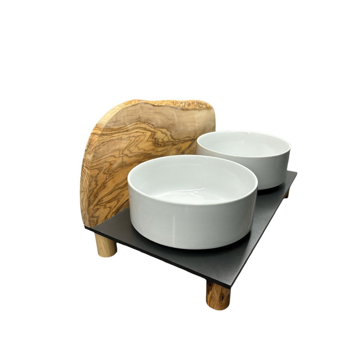 Für den anspruchsvollen Hund! Zwei weiße Porzellanschalen je 1,5 Liter als Futternapf, auf einer schwarzen, extrem unempfindlichen Platte (40 x 20 cm). Der Clou: Als Spritzschutz ist ein rustikales, massives Brett aus Olivenholz fixiert. Durch den natürlich rustikalen Rand ähnelt es in dieser Kombination einem Berg. Antirutsch-Füße sorgen für sicheren Stand. Zudem ist die gesamte Futterstation erhöht (siehe unterschiedliche Höhen).