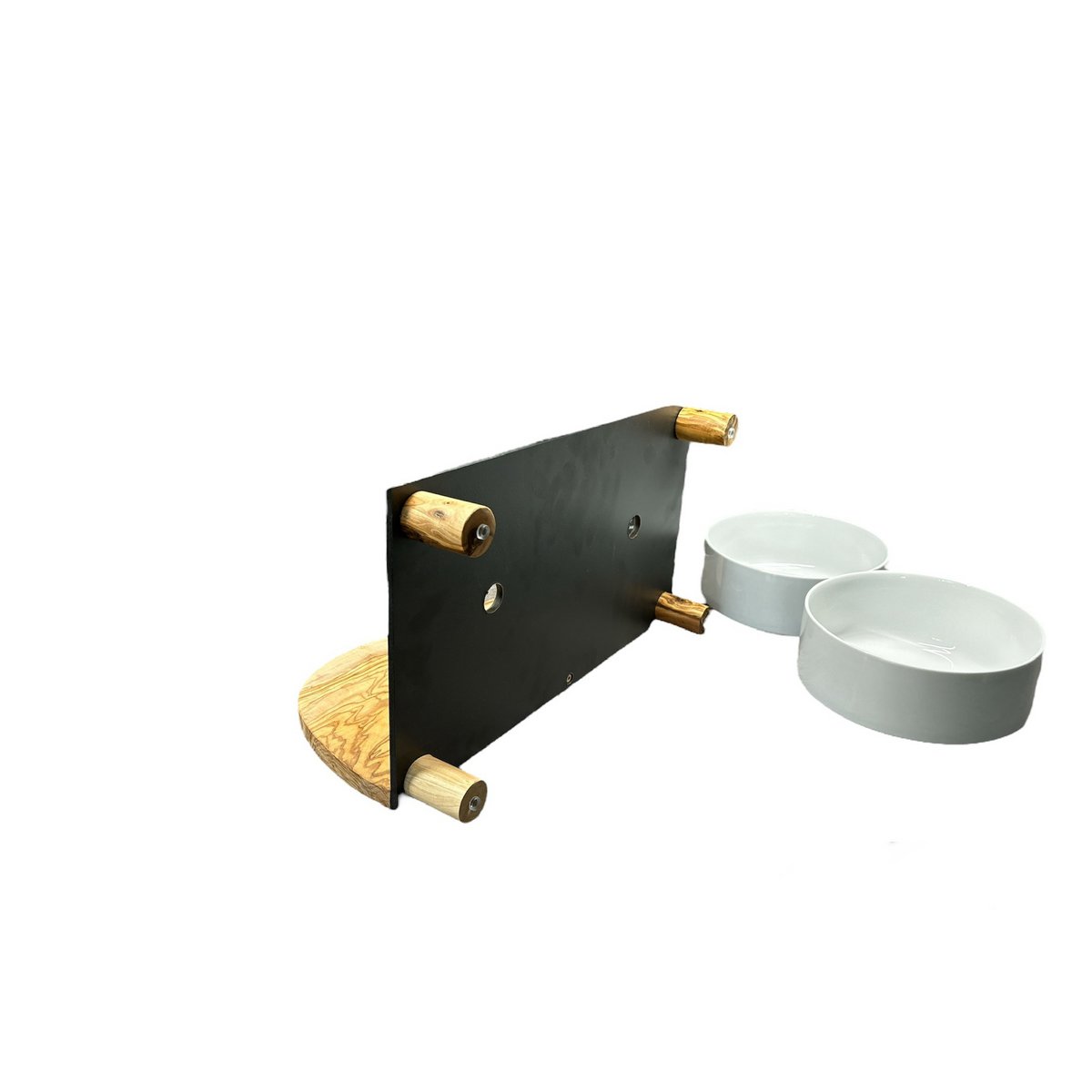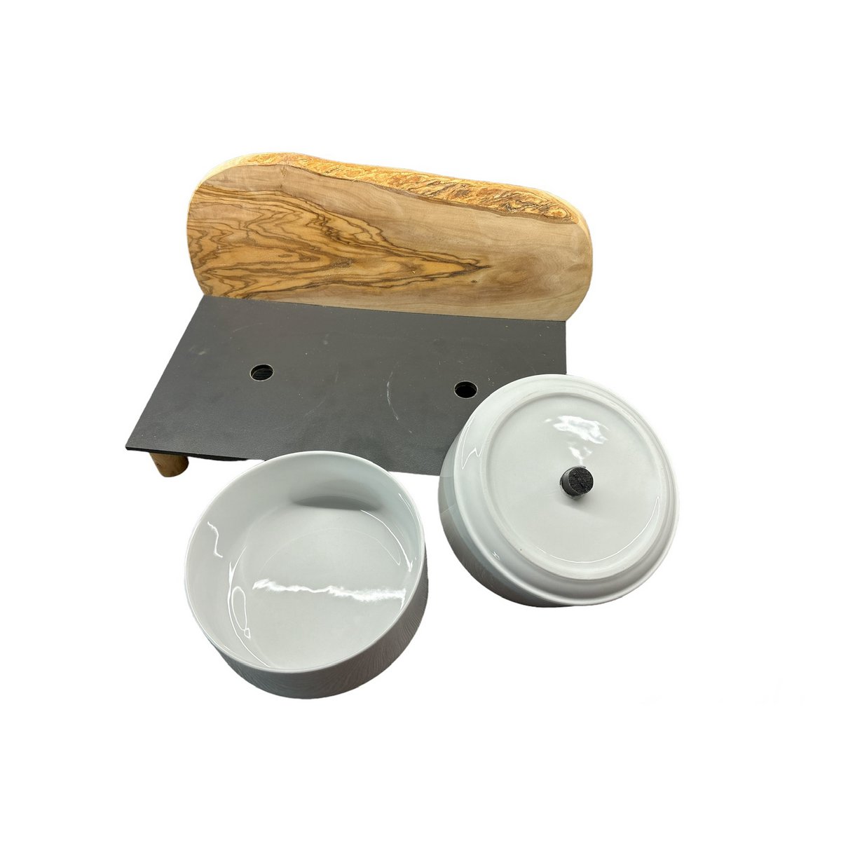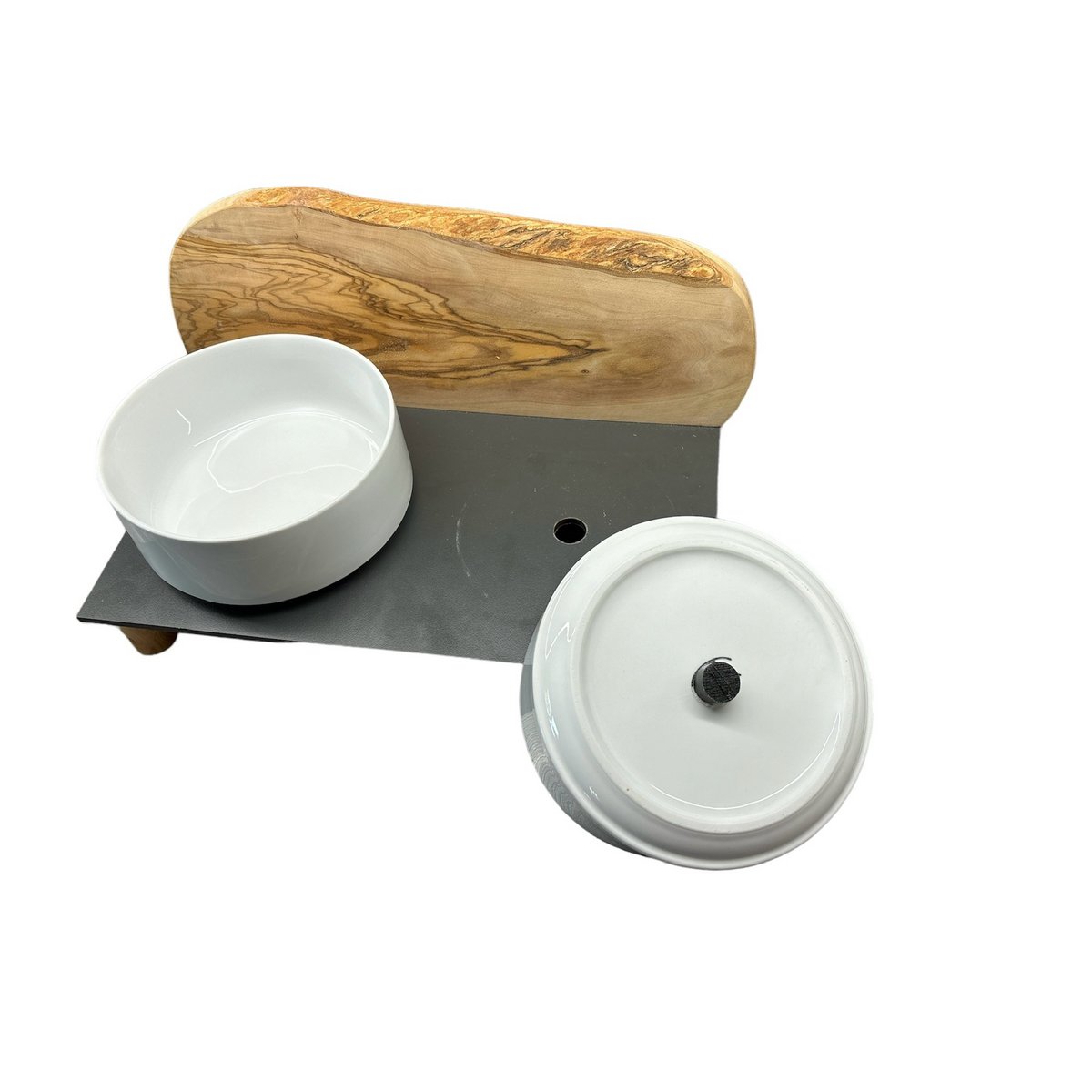 Für den anspruchsvollen Hund! Zwei weiße Porzellanschalen je 1,5 Liter als Futternapf, auf einer schwarzen, extrem unempfindlichen Platte (40 x 20 cm). Der Clou: Als Spritzschutz ist ein rustikales, massives Brett aus Olivenholz fixiert. Durch den natürlich rustikalen Rand ähnelt es in dieser Kombination einem Berg. Antirutsch-Füße sorgen für sicheren Stand. Zudem ist die gesamte Futterstation erhöht (siehe unterschiedliche Höhen).