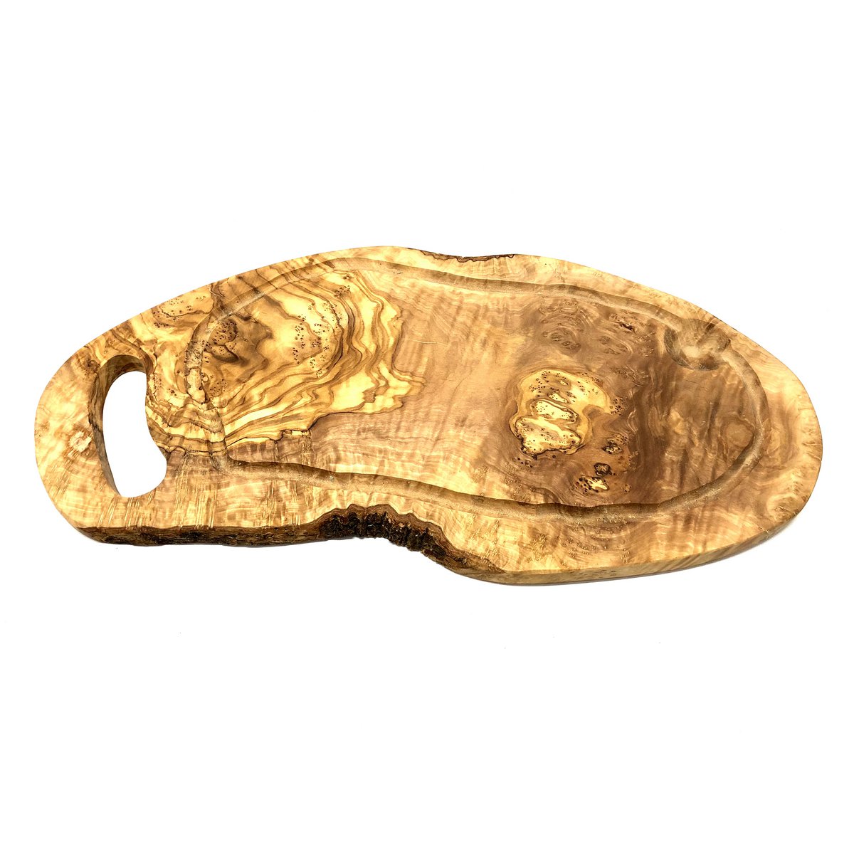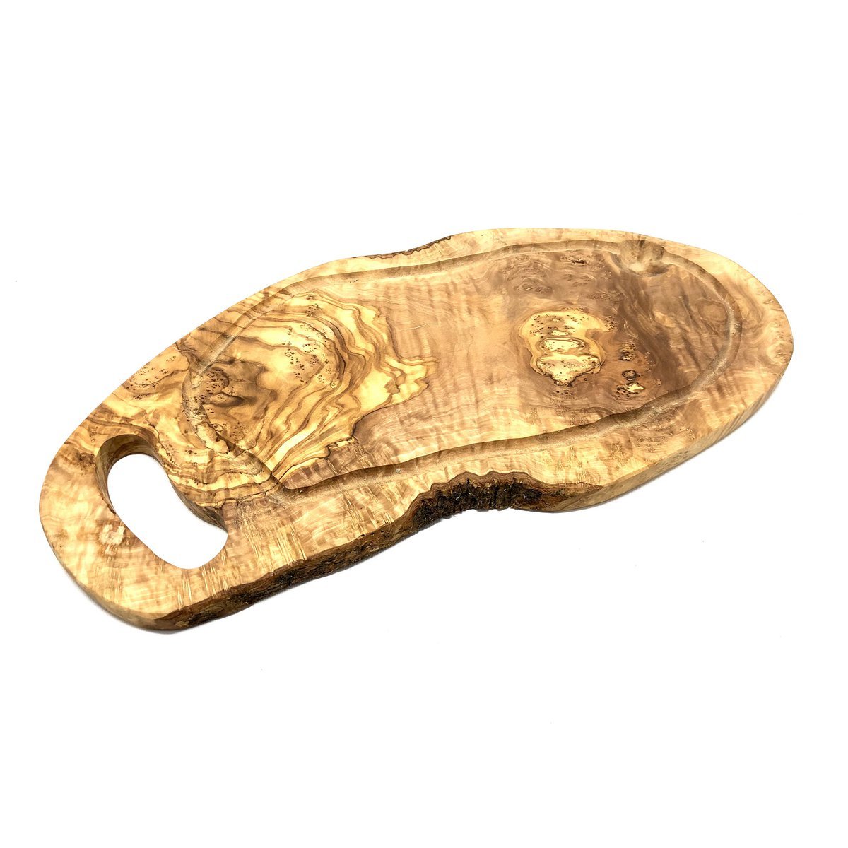 Steakbrett rustikal 36-39 cm mit Saftrille & Grifflasche aus Olivenholz. Ein lauer Sommerabend, nette Leute, ein Grill, saftige Steaks und ein kühles Bier... Dieses rustikal anmutende Steakbrett mit Griff und Saftrille aus Olivenholz, ist der Renner auf jedem Grillabend. Aber nicht nur für den Grillabend wunderbar einsetzbar, sondern auch als handliches Schneidebrett oder zum Servieren von Wurst und Käse bestens geeignet. Länge ca. 36 - 39 cm, Breite ca. 20 cm, Höhe ca. 1,5 - 2 cm.