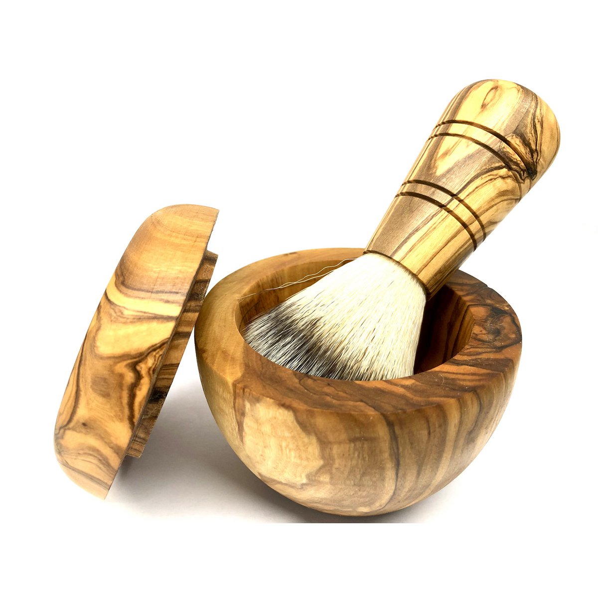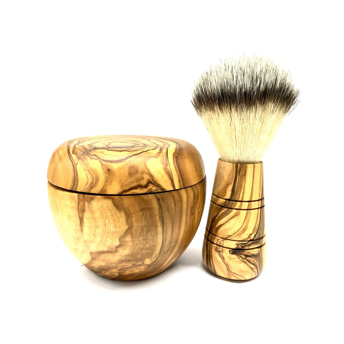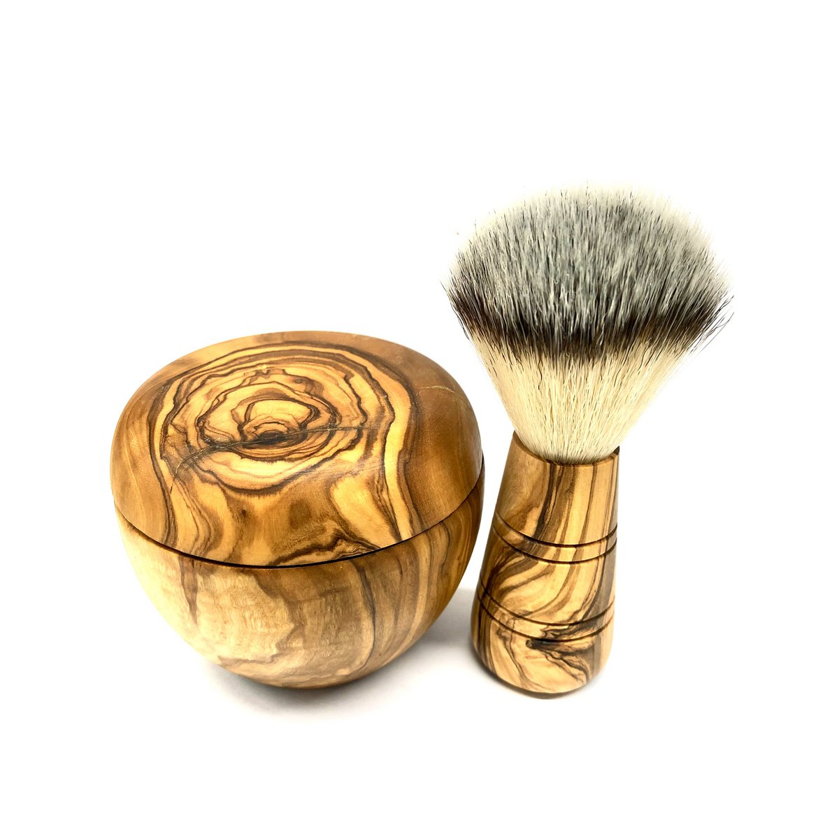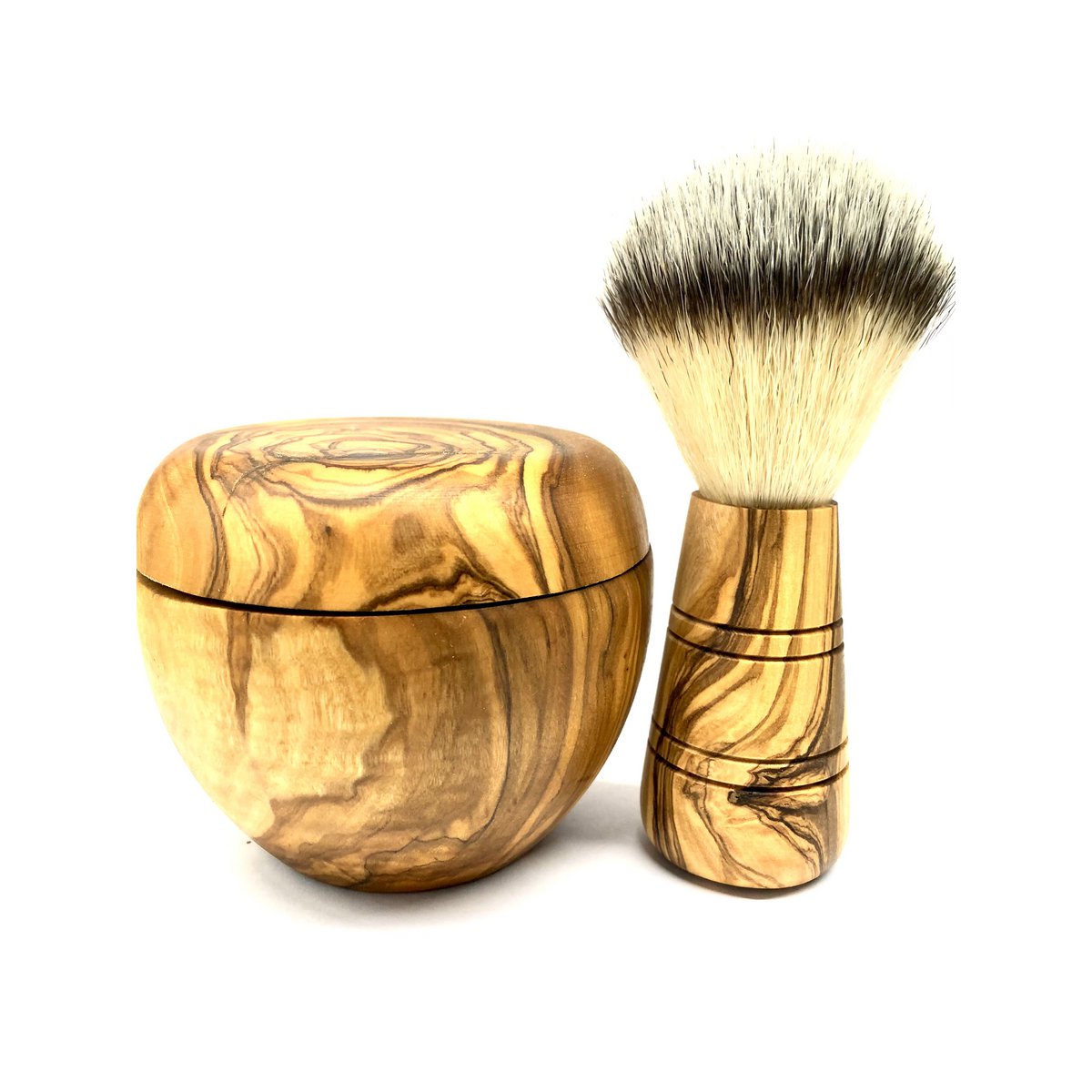 Rasierpinsel mit veganem Kunsthaar mit passender Rasierdose, um die Seife aufschäumen zu können. Für höchste Ansprüche bei der Nassrasur. Das Olivenholz vom Griff des Rasierpinsels und der Dose ist unbehandelt bzw. nur geölt und erhält dadurch seine Ausdruckskraft. Rasierpinsel: Länge ca. 9 cm, Durchmesser ca. 3,5 cm; Rasierdose: Höhe ca. 7 cm, Außendurchmesser ca. 9 cm