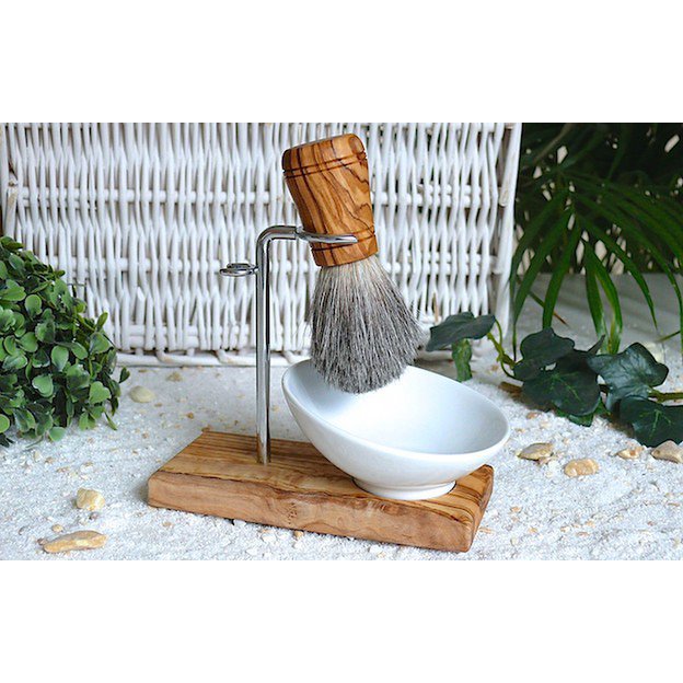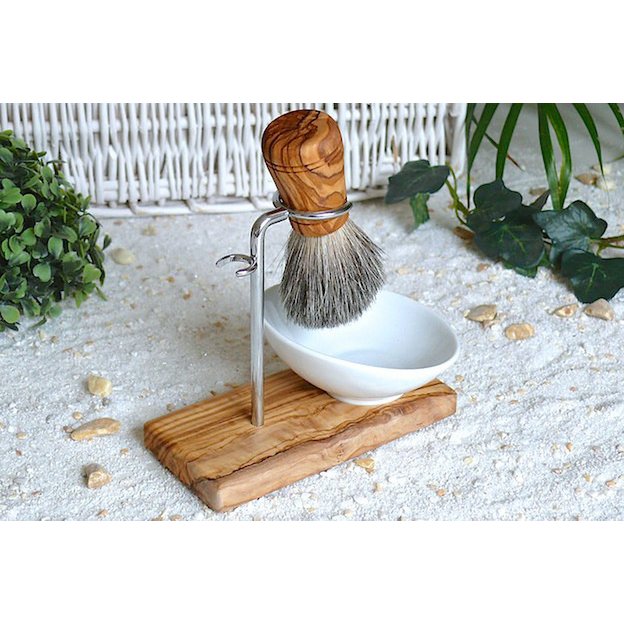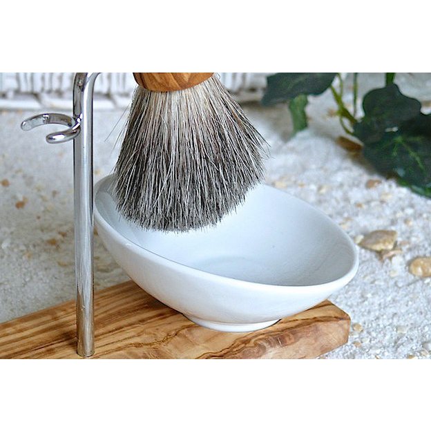 Modern und futuristisch ist dieser Rasierpinselhalter auf einer Platte aus Olivenholz, inkl. einem Rasierpinsel mit echtem Dachsrückenhaar auf Olivenholzgriff. Dazu passend eine moderne, abgeschrägte Rasierschale aus Porzellan. Größe/Maße/Gewicht Rasierpinselhalter KLASSIK PLUS Höhe ca. 12 cm Länge ca. 14 cm Breite ca. 7 cm Rasierschale Porzellan (schräg) Höhe ca. 4,5 cm Durchmesser ca. 10 cm Rasierpinsel Länge ca. 9 cm