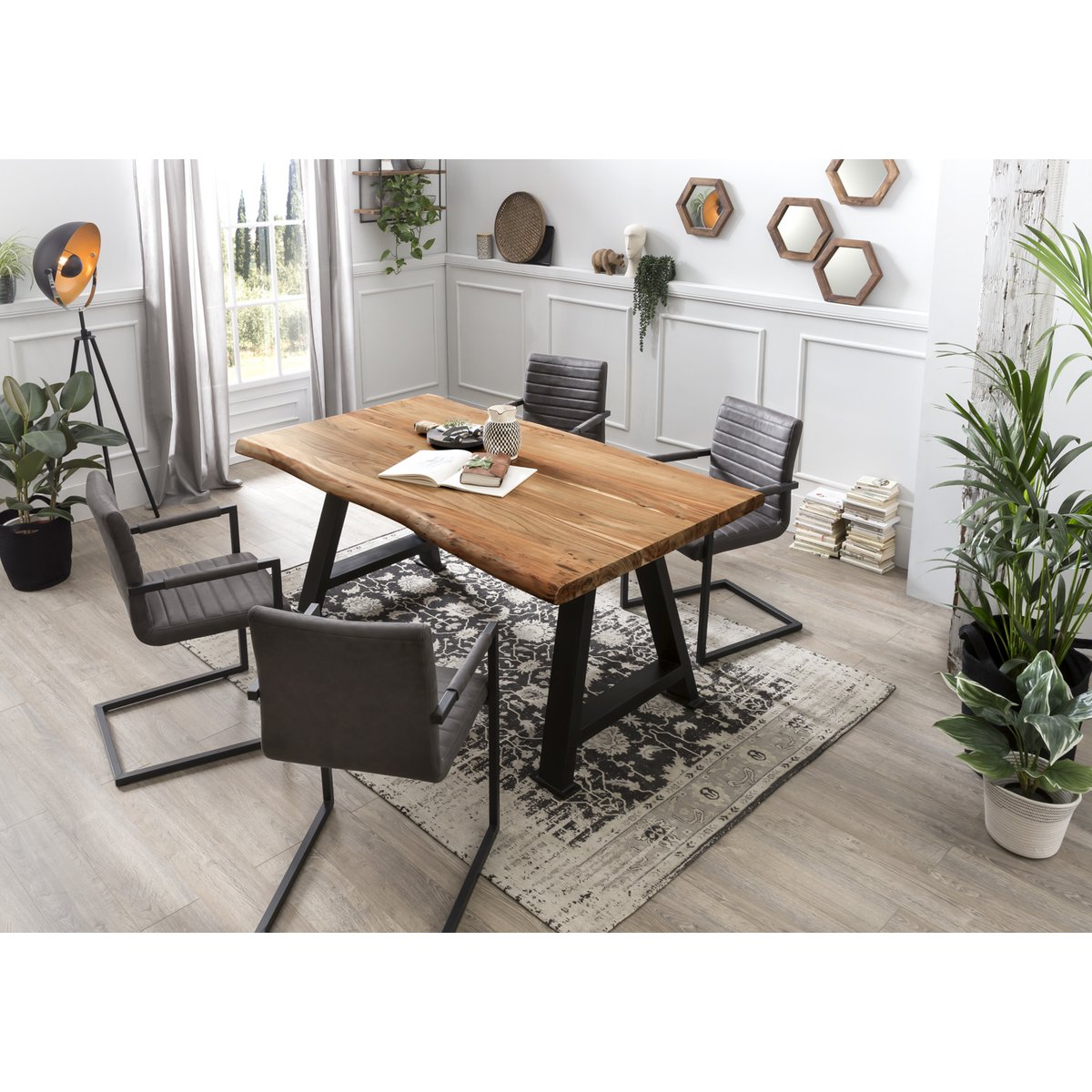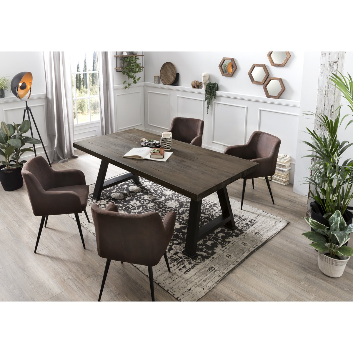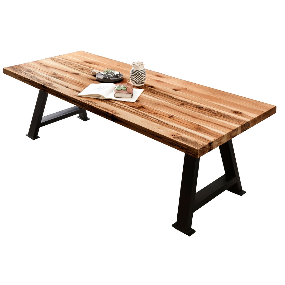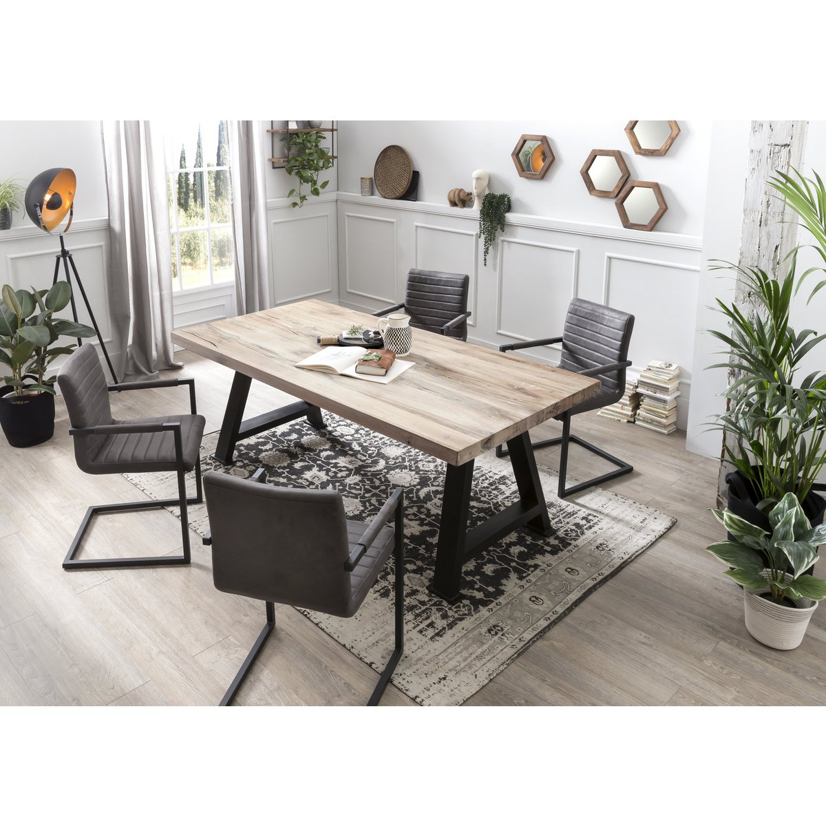 Das Tischgestell aus Stahl in der Form A-Fuß der Farbe antikschwarz ist konzipiert für Tischplatten von einer Länge von 160 cm bis 240 cm und einer Breite von mindestens 90 cm. Die Auflagenstrebe des Gestells hat eine Länge von 80 cm. Mit der passenden Holzplatte verwandelt sich der Baukasten im Esszimmer mit den passenden Stühlen in einen Esszimmertisch, im Hotel in einen Frühstückstisch oder in einen Konferenztisch. In der Gastrobranche lässt sich in schon vorhandenes Mobiliar mit diesem Gestell und einer Platte Ihrer Wahl der passende Restauranttisch zusammensetzen. Breite der Rohre 5 cm, Breite der oberen Strebe 80 cm.