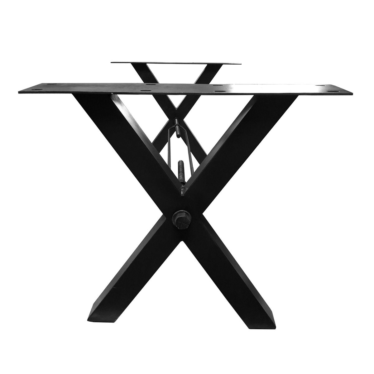 Das Tischgestell aus Stahl in der Form X-Fuß der Farbe antikschwarz ist konzipiert für Tischplatten von einer Länge von 160 cm bis 240 cm und einer Breite von mindestens 90 cm. Die Strebe für die Längeneinstellung (innen gemessen) ist einstellbar von ca. 112 cm - 180 cm. Mit der passenden Holzplatte verwandelt sich der Baukasten im Esszimmer mit den passenden Stühlen in einen Esszimmertisch, im Hotel in einen Frühstückstisch oder in einen Konferenztisch. In der Gastrobranche lässt sich in schon vorhandenes Mobiliar mit diesem Gestell und einer Platte Ihrer Wahl der passende Restauranttisch zusammensetzen. Vierkantrohre 7,5x7,5 cm, Längeneinstellung (innen gemessen) ca. 112 - 180 cm.