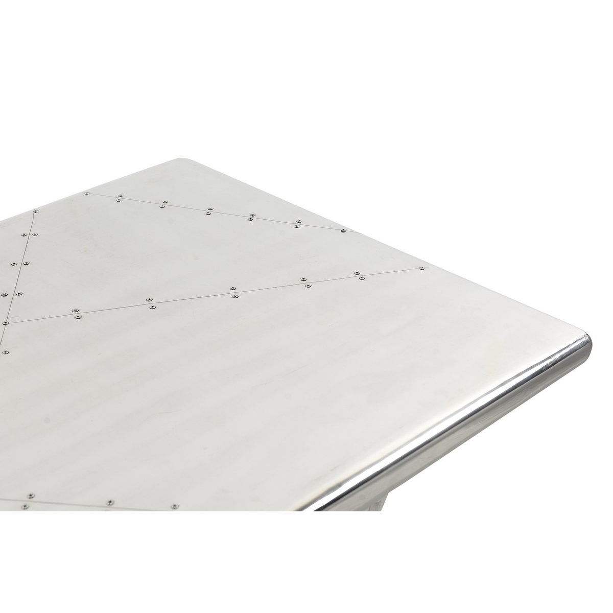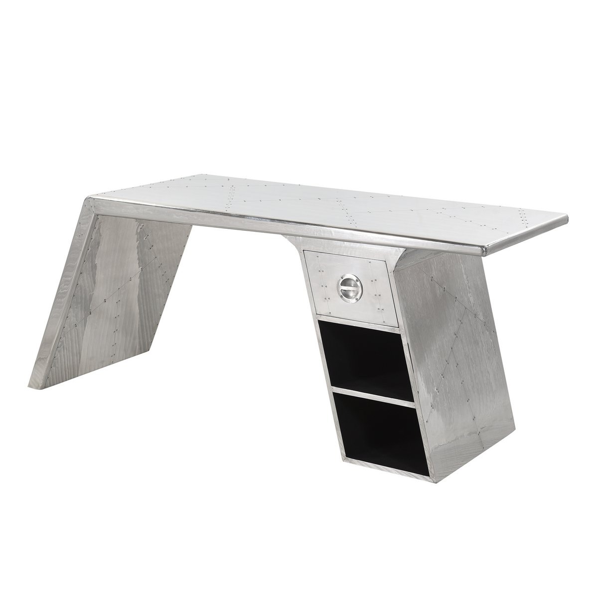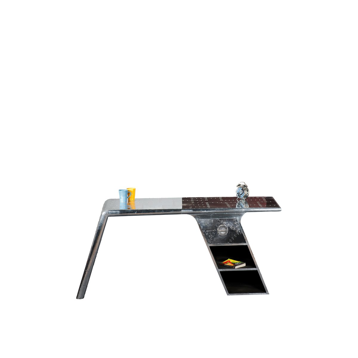 Hier werden den Themen VINTAGE und FACTORY DESIGN besonders gehuldigt. Inspiriert von den Pionieren der Luftfahrt werden diese Möbel von Hand mit Alu belegt und mit unzähligen Schrauben zu einzigarten Objekten, die sich wohltuend von der Masse abheben. Schubladenführungen und Beschläge aus Metall halten den Belastungen des Alltags stand. Eine Schublade und 2 offene Fächer erhöhen den praktischen Nutzen. Tischfläche 150 cm, Fächer: 30x22x21 cm, Platz zwischen den Beinen: oben 77 cm, unten 120 cm, Abstand zwischen Tischplatte und Boden 70 cm.