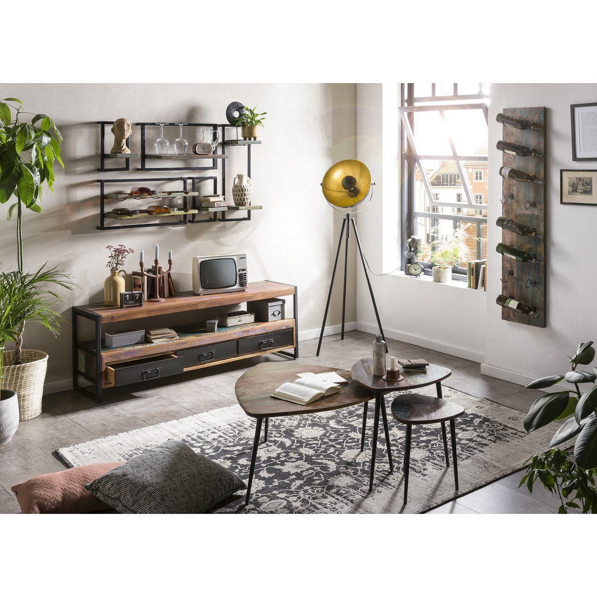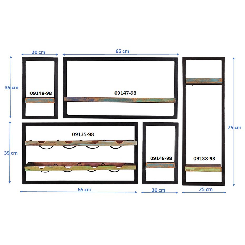 Dieses Set aus 5 Wandregalen mit bunt lackiertem, auf alt getrimmten recyceltem Holz und ebenfalls auf antik getrimmten Metallrahmen können Sie ganz individuell gestaltet aufhängen und somit Ihrer Kreativität freien Lauf lassen. Natürlich können Sie die Regale auch einzeln in verschiedenen Räumen verwenden, die Nutzung ist also äußerst vielseitig. Der besondere Clou bei diesem Set ist das Weinregal, welches Platz für 8 Flaschen bietet. Maße der Einzelregale: 2 x 20x25x35 cm, 2 x 65x25x35 cm + 1 x 25x25x75 cm.