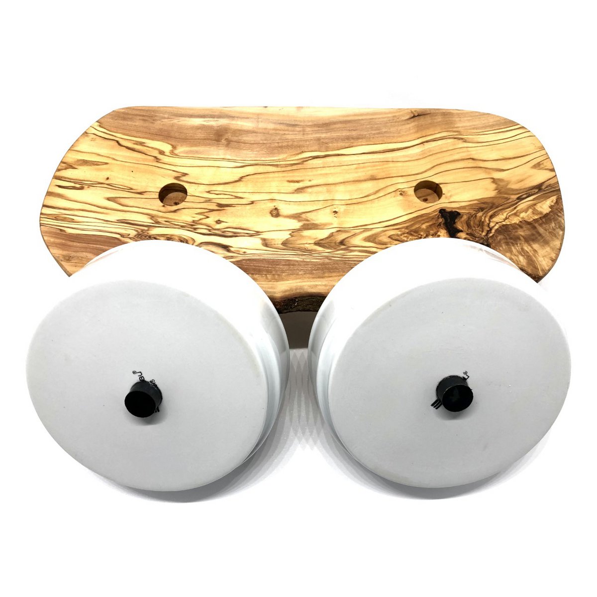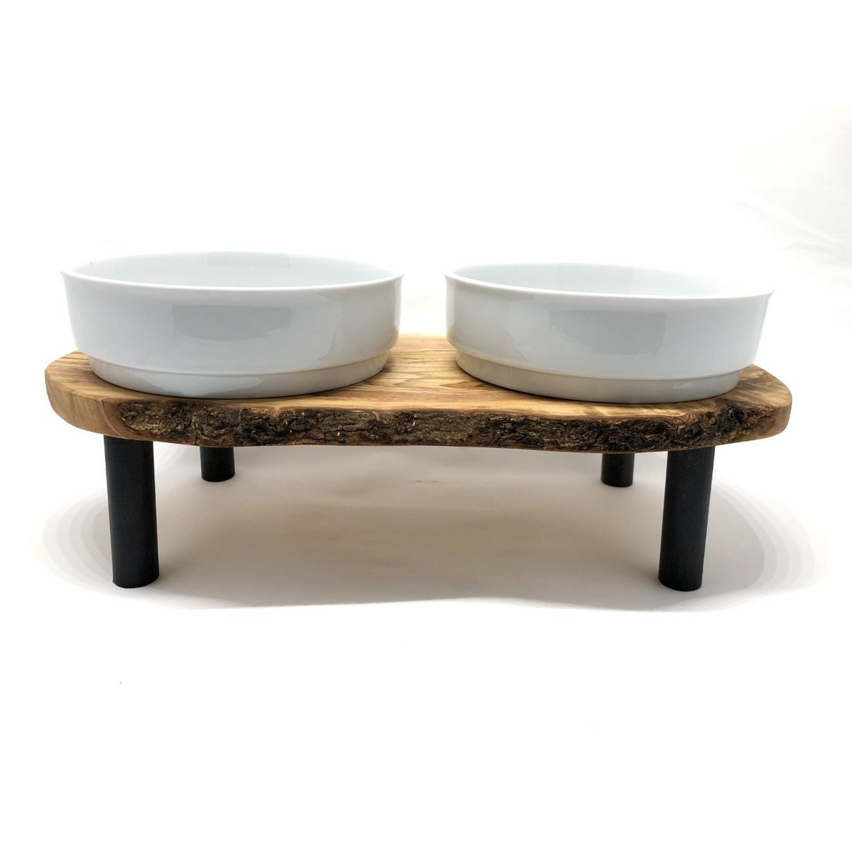 Die beiden Porzellanschalen für Trocken- und Nassfutter (jeweils 1,5 Liter, Ø 18 cm) sind auf einem Sockel aus massiven Olivenholz fixiert. Der Hund kann die Schalen bei Fressen nicht vom Sockel lösen. Zwecks Reinigung können die Schalen natürlich vom Mensch sehr leicht vom Sockel gehoben werden. Der Sockel ist ca. 40 – 45 cm lang und ca. 15 cm breit. 100% Natur! Wir haben auf den Einsatz von künstlichem Holzschutz komplett verzichtet. Durch mehrfache Behandlung mit Olivenöl ist das Holz gegen Schmutz und Feuchtigkeit nachhaltig geschützt. Auf der Unterseite befinden sich 4 Füße (Vollholz Buche, schwarz lackiert, H. ca. 8,5 cm).