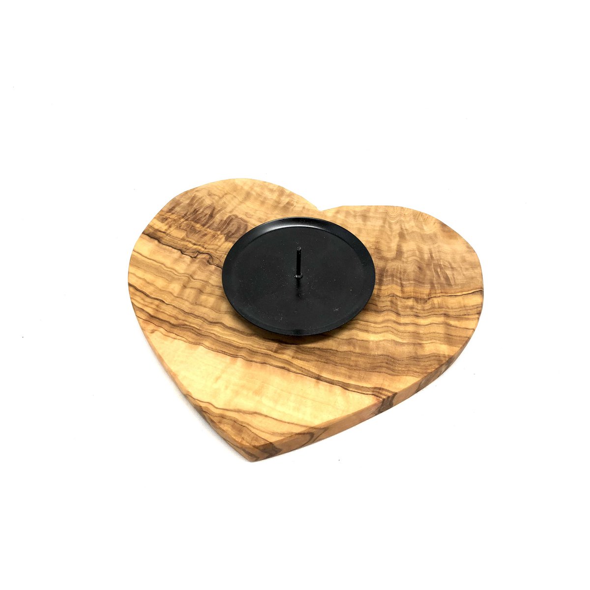 Sehr schöner Kerzenhalter auf einem Sockel in Form eines Herz aus Olivenholz. Durchmesser vom Herz ca. 15 cm und ca. 1,5 cm hoch.