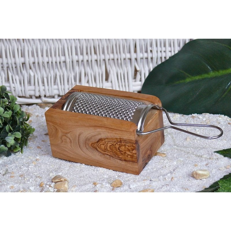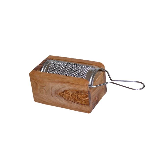Parmesan-/ Käsereibe aus Olivenholz Die Käse- und Parmesanreibe aus Olivenholz in unserem Sortiment überzeugt mit ihrer hochwertigen Edelstahlreibe und der praktischen Lade, die den geriebenen Käse verlustfrei auffängt. Ob Parmesan, Pecorino, Gruyere und andere Hartkäsesorten... Sie machen die Pasta, das Gratin, das Risotto und viele andere Gerichte erst zum wahren Genuss.Die Käsereibe aus Olivenholz kann auch wunderbar zum Reiben von Muskatnüssen verwendet werden. Größe/Maße/Gewicht Gesamtlänge: ca. 19 cm Box: Länge: 11 cm Breite: ca. 7 cm Höhe: ca. 6 cm