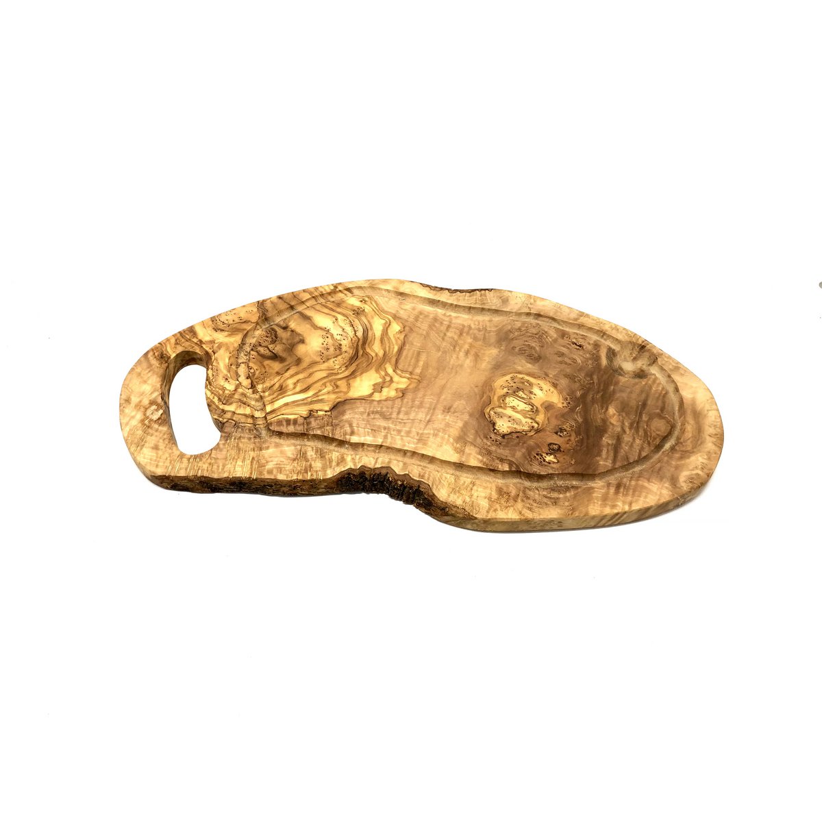 Steakbrett rustikal ca. 45 - 49 cm mit Saftrille & Grifflasche aus OlivenholzEin lauer Sommerabend, nette Leute, ein Grill, saftige Steaks und ein kühles Bier... Dieses rustikal anmutende Steakbrett, mit Griff und Saftrille aus Olivenholz, ist der Renner auf jedem Grillabend. Aber nicht nur für den Grillabend wunderbar einsetzbar, sondern auch als handliches Schneidebrett oder zum Servieren von Wurst und Käse bestens geeignet.