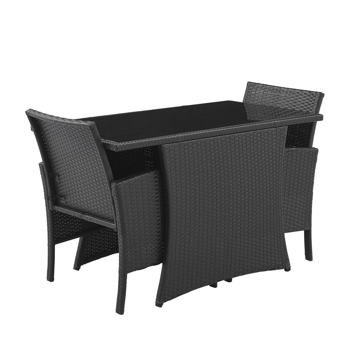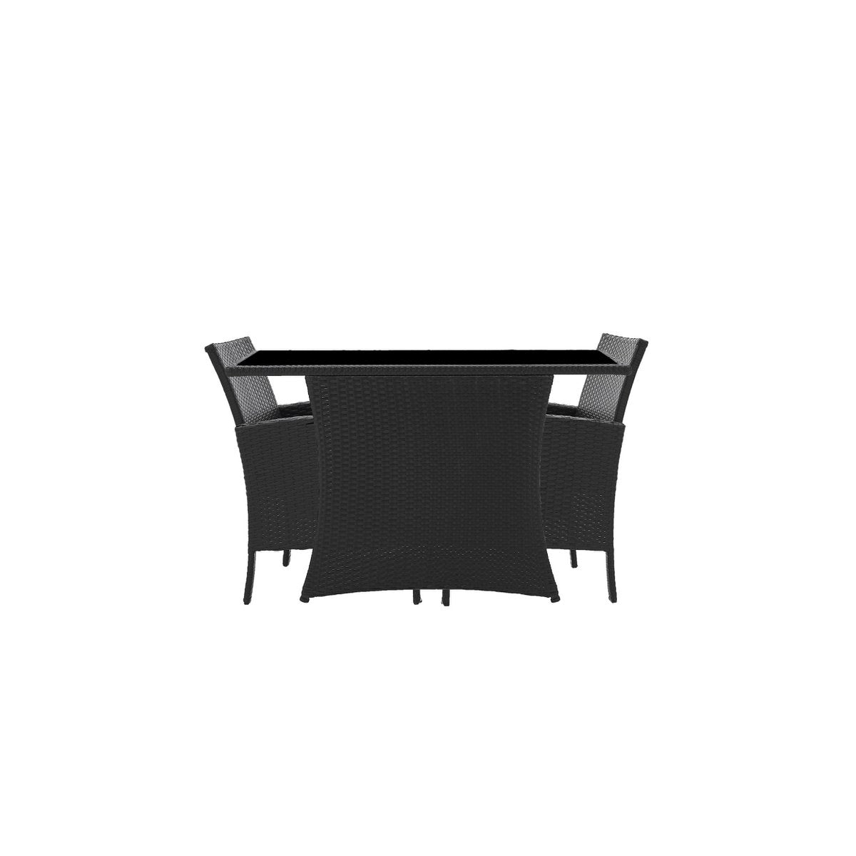 Bei schönem Wetter mit Familie oder Freunden draußen im Garten sitzen, dazu Kaffee und Kuchen und die Welt ist perfekt. Genießen Sie den bequemen Sitzkomfort dieser Lounge. Diese stabile und wetterfeste Sitzgruppe aus Polyratten mit 2 komfortablen Sesseln inklusive Sitzkissen und einem Tisch mit pflegeleichter Glasplatte lässt mit seinem extravaganten Design keine Wünsche offen. Die Sessel lassen sich zudem platzsparend weit unter dem Tisch verstauen. Selbstverständlich können Sie diese Möbel aber auch in einem Wintergarten aufstellen. Egal, wo sie platziert werden, sie zaubern einen angenehmen Urlaubsflair. Maße des Stuhls: 59 x 64 x 81 cm, Maße des Tischs: 120 x 66 x 71 cm, Plattenstärke 5 mm, Bezug 100% PES
