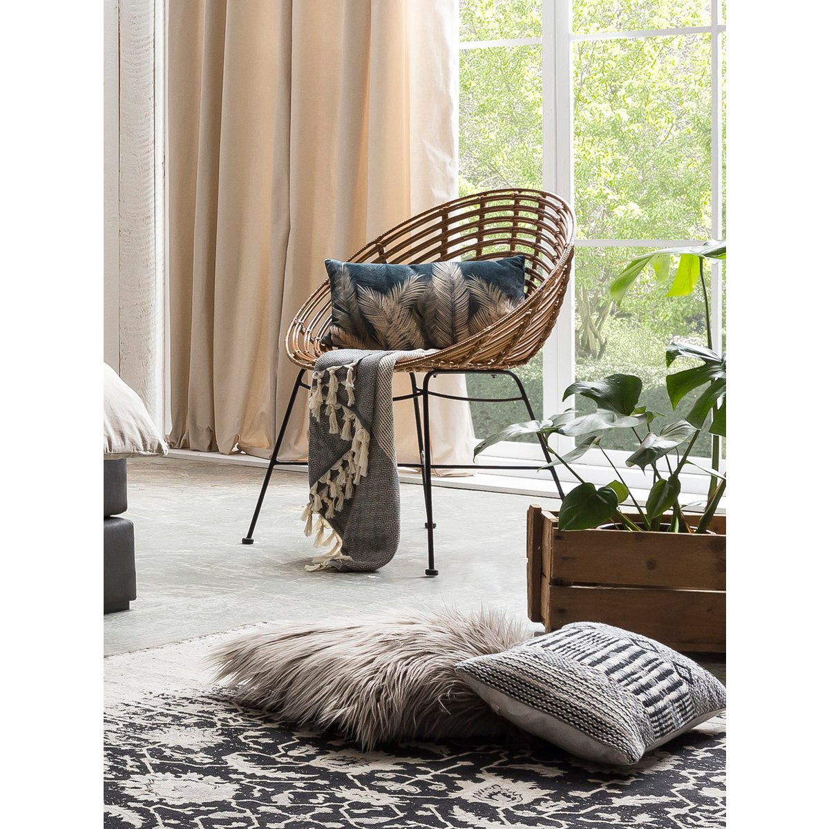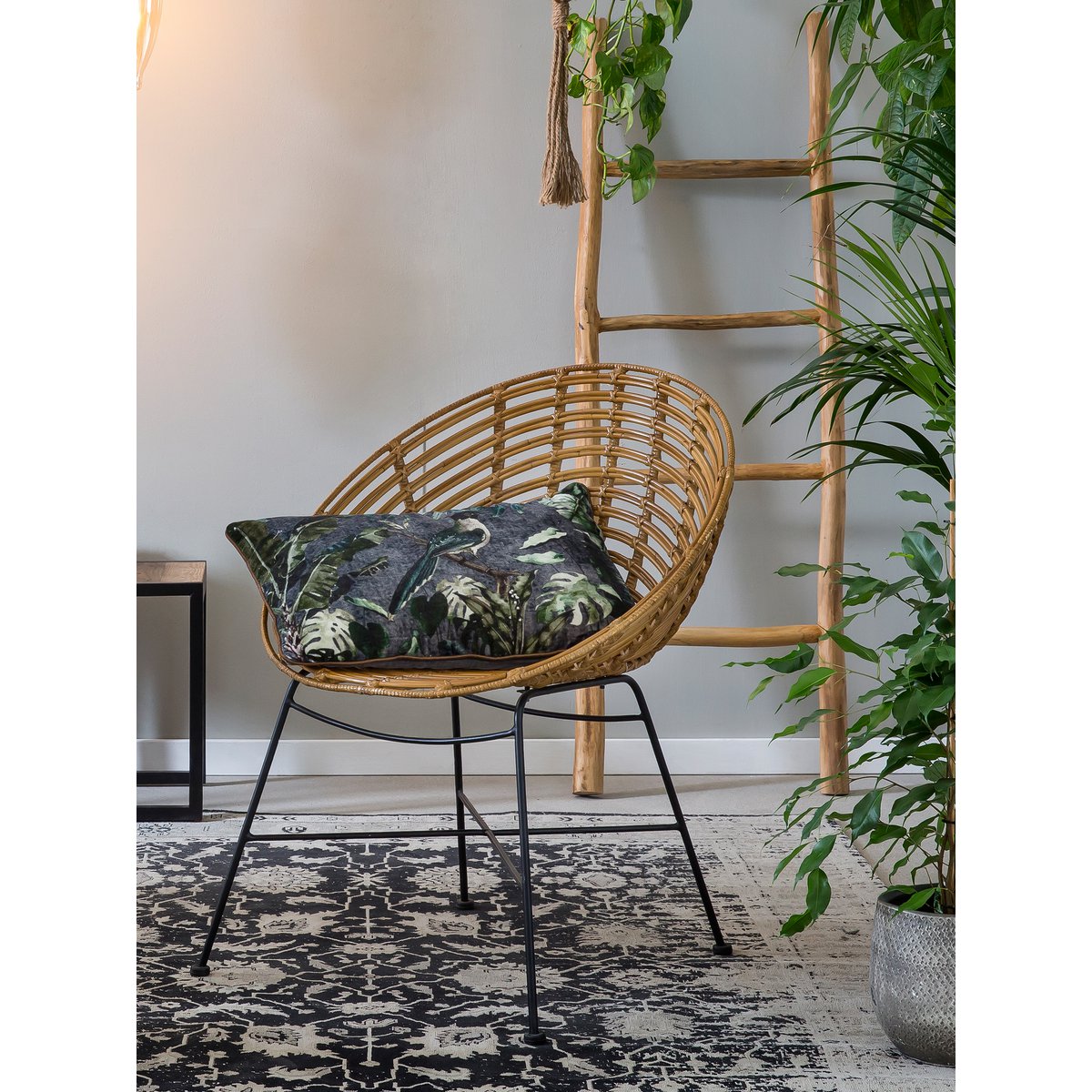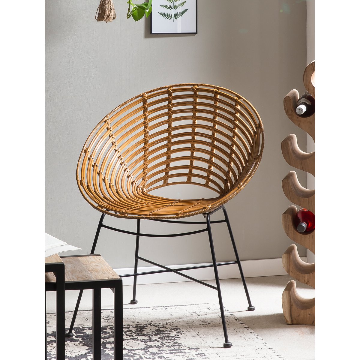 Mit diesem Rattanstuhl in einer extravaganten Form holen Sie sich südländisches Flair in Ihren Wohnraum oder Ihren Wintergarten. Aber auch mit skandinavischem Design lässt sich dieser Schalensessel bestens kombinieren. Die Beine aus schwarzem Metall sind robust und sorgen für Stabilität, außerdem schaffen sie sowohl farblich als auch vom Material einen schönen Kontrast zu dem naturfarbigen Rattan. Die rundgeformte Sitzschale macht diesen Korbstuhl zu einem echten Hingucker, um den Ihr Besuch sie beneiden wird. Sitzhöhe 45 cm, Sitzbreite 50 cm, Sitztiefe 50 cm.