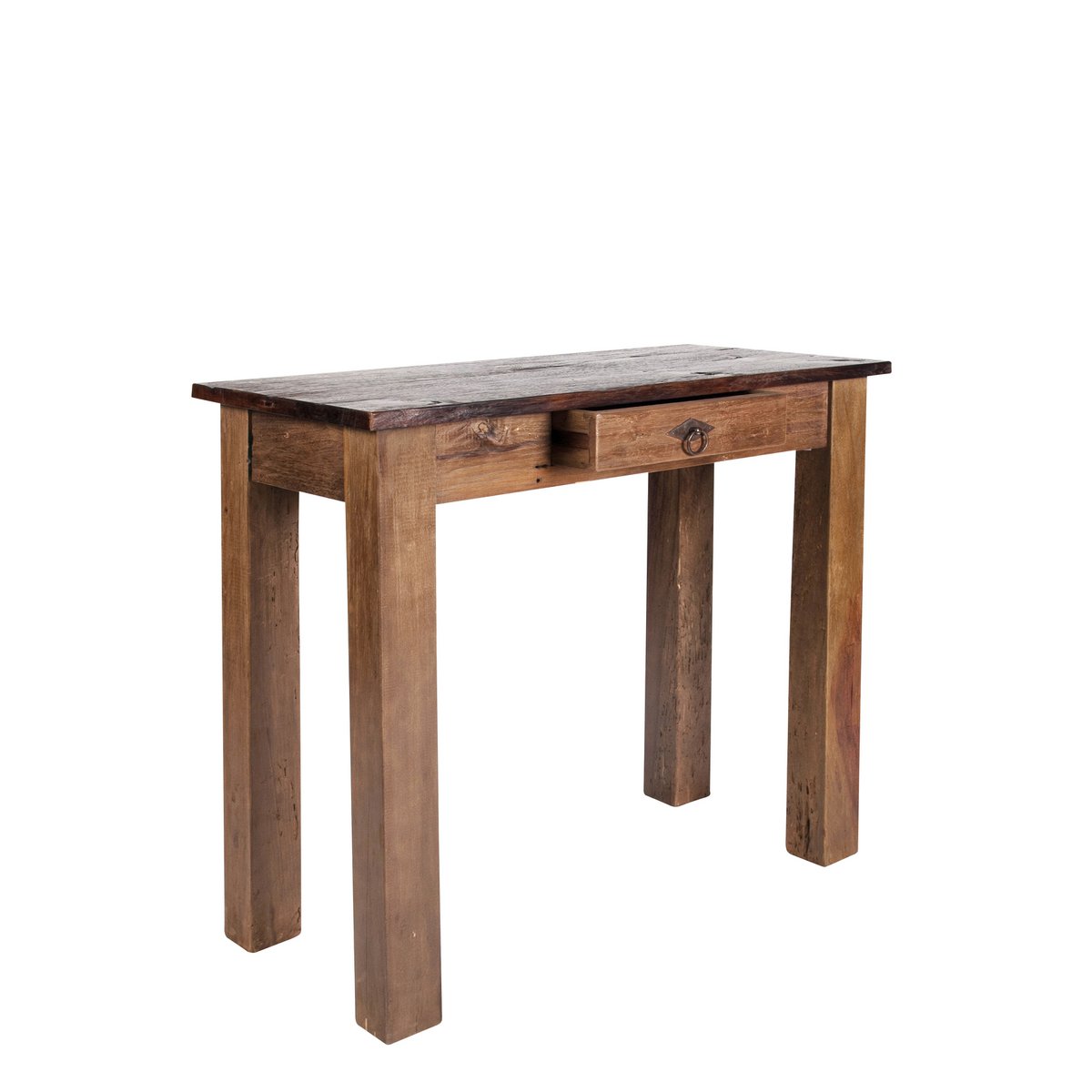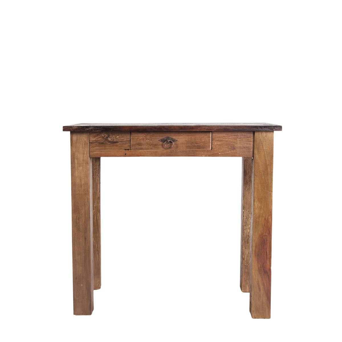 Ein attraktiver Blickfang in Ihrem Wohnraum ist dieser Telefontisch aus recyceltem Teak. Er punktet mit einem Mix aus recyceltem Holz in warmem Naturton und einem Metallgriff. Der Materialmix von warmem Holz und derben Metall liegt voll im Trend und sorgt für interessante Kontraste in der Optik. Neben seiner Optik überzeugt er mit fühlbarer Struktur. Der Konsolentisch lässt sich harmonisch in verschiedene Wohnprogramme integrieren. Hinter einer Schublade verbirgt sich ausreichend Stauraum, in dem Alltagsgegenstände verstaut werden können. Gefertigt wird der Tisch aus wiederverarbeitetem Holz alter Scheunen und Häuser - jedes Stück ist ein Unikat. Sorgt für eine wohnliche Atmosphäre: der Telefontisch mit modernem Materialmix. Plattenstärke 25 mm, Höhe bis zur Tischzarge 63,5 cm.