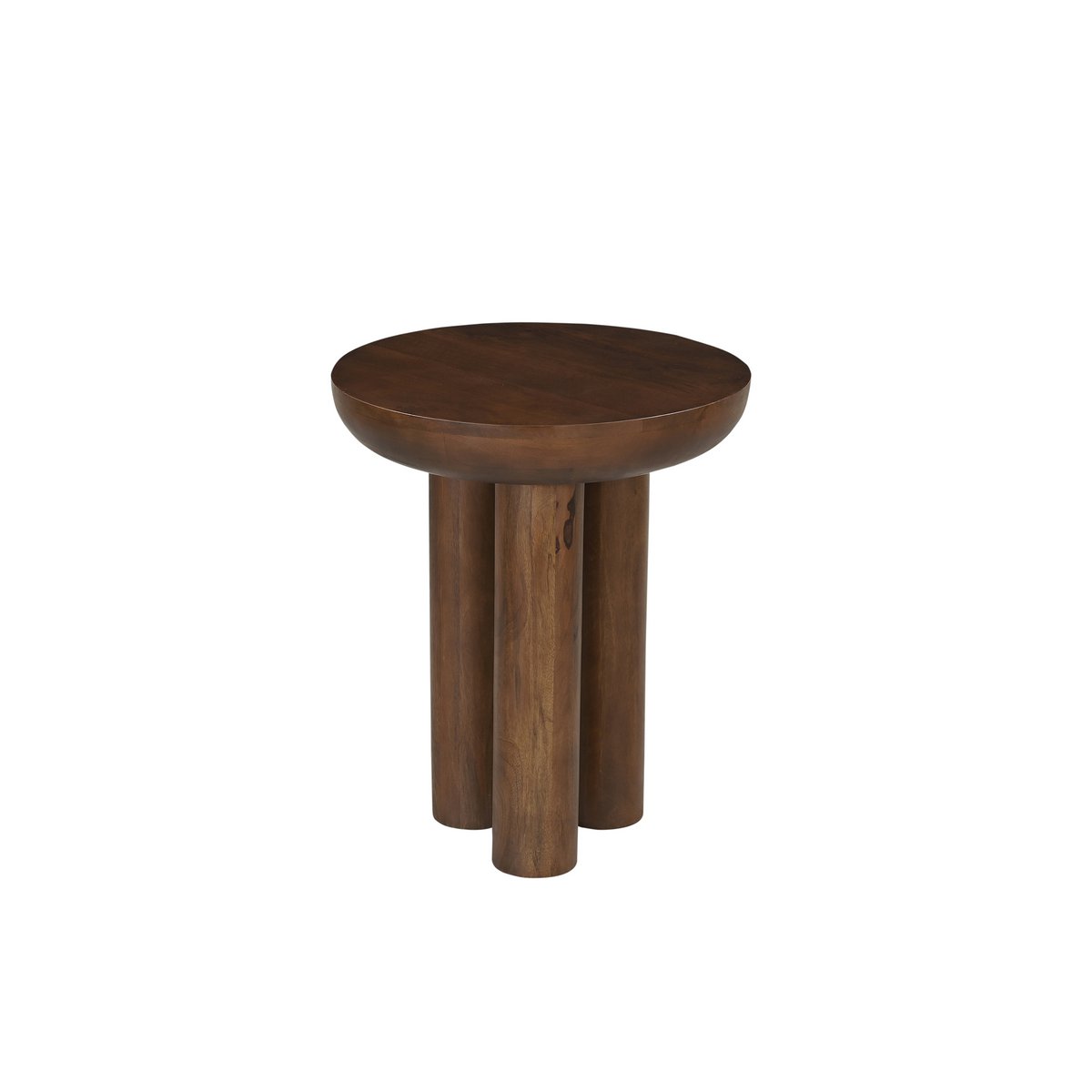 Der Beistelltisch aus massivem Mangoholz verbindet schlichte Eleganz mit praktischer Funktionalität. Mit seiner runden Tischplatte und den drei zylinderförmigen Füßen ist er ein vielseitiges Möbelstück, das in jedem Raum eine stilvolle und nützliche Ergänzung darstellt. Gefertigt aus massivem Mangoholz, zeichnet sich dieser Beistelltisch durch seine außergewöhnliche Robustheit und Langlebigkeit aus. Das Holz ist bekannt für seine markante Maserung und warme, braune Farbgebung, die eine einladende und natürliche Atmosphäre schafft. Jedes Möbelstück aus Mangoholz ist ein Unikat, das durch seine charakteristische Struktur auffällt. Die runde Tischplatte bietet eine kompakte, aber praktische Oberfläche, ideal für das Abstellen von Getränken, Büchern oder Dekorationsgegenständen. Durch die runde Form fügt sich der Tisch harmonisch in verschiedene Wohnstile ein, von modern bis rustikal, und verleiht jedem Raum eine sanfte und einladende Ausstrahlung. Die drei zylinderförmigen Füße bieten nicht nur stabile Standfestigkeit, sondern auch ein minimalistisches und modernes Design. Diese schlichte und zugleich robuste Konstruktion unterstützt die Tischplatte optimal und sorgt für ein ausgewogenes Gesamtbild. Ob als Beistelltisch neben dem Sofa, als Nachttisch im Schlafzimmer oder als dekoratives Element in einer Leseecke – dieser Tisch ist vielseitig einsetzbar und passt zu vielen Wohnkonzepten. Sein kompaktes Design ermöglicht eine flexible Platzierung in verschiedenen Räumen, ohne auf Funktionalität zu verzichten. Ø der Tischplatte: 50 m, Höhe der Tischplatte: ca. 10 cm, Ø der Zylinder-Füße: 10 cm, Abstand zwischen den Zylindern: ca. 6,5 cm