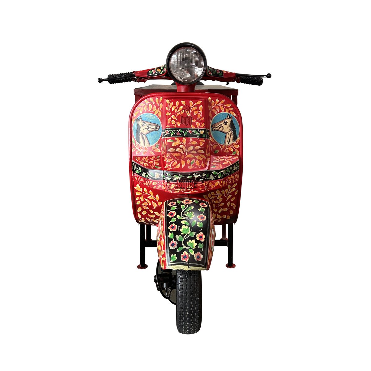 Dieser Thekentisch ist weit mehr als nur ein Möbelstück – er ist ein echtes Statement. Gefertigt aus einem recycelten Roller, verbindet er auf einzigartige Weise Nachhaltigkeit mit außergewöhnlichem Design. Die kräftige rote Lackierung, verziert mit bunten, kunstvollen Mustern im sizilianischen Stil, macht den Tisch zu einem absoluten Hingucker in jeder Umgebung – sei es in der heimischen Bar, als Stehtisch im Partyraum oder als Theke in einem besonderen Ladengeschäft. Mit viel Liebe zum Detail gefertigt, bietet dieser Thekentisch nicht nur visuelle Highlights, sondern auch praktische Features: Eine integrierte Ablage für bis zu 6 Flaschen sorgt für Ordnung und schnellen Zugriff auf Ihre Lieblingsgetränke. Gläser finden ihren Platz im clever integrierten Gläserhalter, und ein zusätzlicher Ablageboden bietet Raum für Zubehör, Snacks oder Dekoration. Die massive Tischplatte mit einer Stärke von 20 mm rundet das durchdachte Design ab und sorgt für Stabilität und Langlebigkeit. Die schwarzen Reifen unterstreichen den authentischen Charakter des Rollers und geben dem Tisch eine stabile Basis mit industriellem Charme. Jeder Tisch ist ein Unikat – inspiriert von der Lebensfreude und Farbenpracht Siziliens – und bringt mediterranes Flair direkt in Ihr Zuhause. Ob als stylischer Treffpunkt bei Ihrer nächsten Feier oder als originelle Theke: Dieser Thekentisch zieht alle Blicke auf sich und erzählt seine ganz eigene Geschichte.