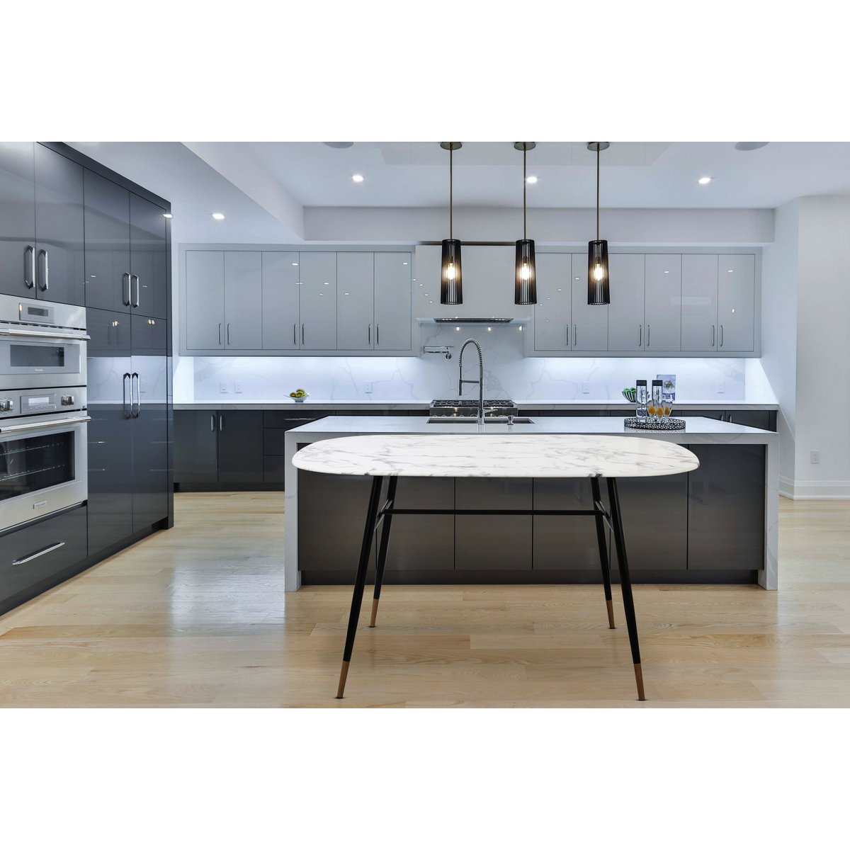 Dieser elegante Esstisch mit filigranem Metallgestell und einer abgerundeten Glasplatte in Marmoroptik lässt Ihren Essbereich gleich viel edler wirken. Plattenstärke 10 mm, Tischplatte mit bedrucktem Papier in Marmoroptik und mehrschichtigem Harzüberzug, Abstand zwischen den Tischbeinen: Kurze Seite ca. 79 cm, lange Seite ca. 120 cm.