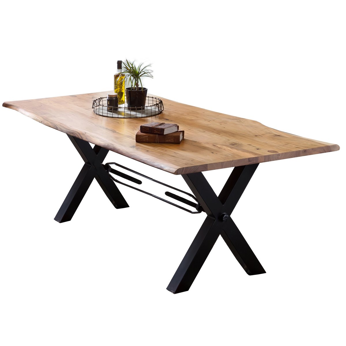 Hier sind Sie richtig, wenn Sie einen Tisch mit Charakter und Einzigartigkeit wollen. Dieser Esstisch wird so leicht nicht noch einmal zu finden sein. Die Massivholz Tischplatte wurde aus Akazie mit Baumkante wie gewachsen gefertigt und ist so einzigartig wie die Natur eben auch. Zudem überzeugt die Platte in natur mit ihrer Stärke von 36 mm. Das moderne X-Gestell in antikschwarz bietet einen schönen Kontrast zur Natur-Tischplatte, sorgt für den angenehmen Industrial Style und verbindet Wohnlichkeit mit Coolness. Ihr Essplatz wird somit zum Eye-Catcher und Treffpunkt, um schöne Stunden mit Familie und Freunden zu verbringen. Hier findet viel mehr statt als nur die täglichen Mahlzeiten. Hinweis: Die Tischplatte ist ein Naturprodukt. Es kann zu Astlöchern, Wuchsrissen und unterschiedlichen Farbschmückungen kommen, welche jedoch kein Reklamationsgrund sind, sondern die Echtheit des Holzes unterstreichen. Plattenstärke 36 mm.