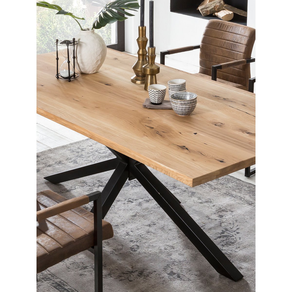Hier sind Sie richtig, wenn Sie einen Tisch mit Charakter und Einzigartigkeit wollen. Dieser Esstisch wird so leicht nicht noch einmal zu finden sein. Die naturfarbene Tischplatte wurde aus Wildeiche gefertigt und ist so einzigartig wie die Natur eben auch. Zudem überzeugt die Platte mit ihrer Stärke von insgesamt 40 mm. Das modische Metallgestell in antikschwarz bietet einen schönen Kontrast zur Tischplatte, sorgt für den angenehmen Industrial Style und verbindet Wohnlichkeit mit Coolness. Ihr Essplatz wird somit zum Eye-Catcher und Treffpunkt, um schöne Stunden mit Familie und Freunden zu verbringen. Hier findet viel mehr statt als nur die täglichen Mahlzeiten. Hinweis: Die Tischplatte ist ein Naturprodukt. Es kann zu Astlöchern, Wuchsrissen und unterschiedlichen Farbschmückungen kommen, welche jedoch kein Reklamationsgrund sind, sondern die Echtheit des Holzes unterstreichen. Plattenstärke 20 mm auf 40 mm aufgedoppelt.