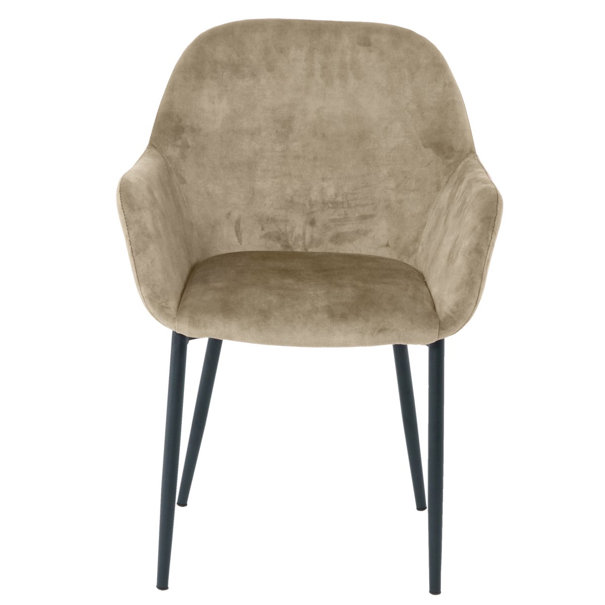 Dieser kompakte Armlehnstuhl überzeugt durch seinen schmeichelnden Samtbezug und eine hohe Bequemlichkeit. Er bietet großen Sitzkomfort und ist zudem auch optisch ein echter Blickfang. Der Samtbezug bildet einen schönen Kontrast mit den matt schwarzen Beinen aus pulverbeschichtetem Metall. Der leicht gerundete Rücken und die ausgestellten Armlehnen schmiegen sich ihrem Körper perfekt an. Dieser Armlehnstuhl lädt zum Verweilen ein. Egal ob am Esszimmertisch oder am Wohnzimmertisch, er ist immer die perfekte Lösung. Sitzhöhe ca. 47 cm, Sitzbreite ca. 40 cm, Höhe der Armlehnen ca. 62 cm, Abstand zwischen den Beinen vorne ca. 43 cm, Abstand zwischen den Beinen seitlich ca. 44 cm, Ø Beine oben ca. 2,5 cm, Ø Beine unten ca. 1,5 cm, Bezug 100% PES, Pilling 4.5, Scheuertouren >40.000, Lichtbeständigkeit 4.0, Farbbeständigkeit 4.0