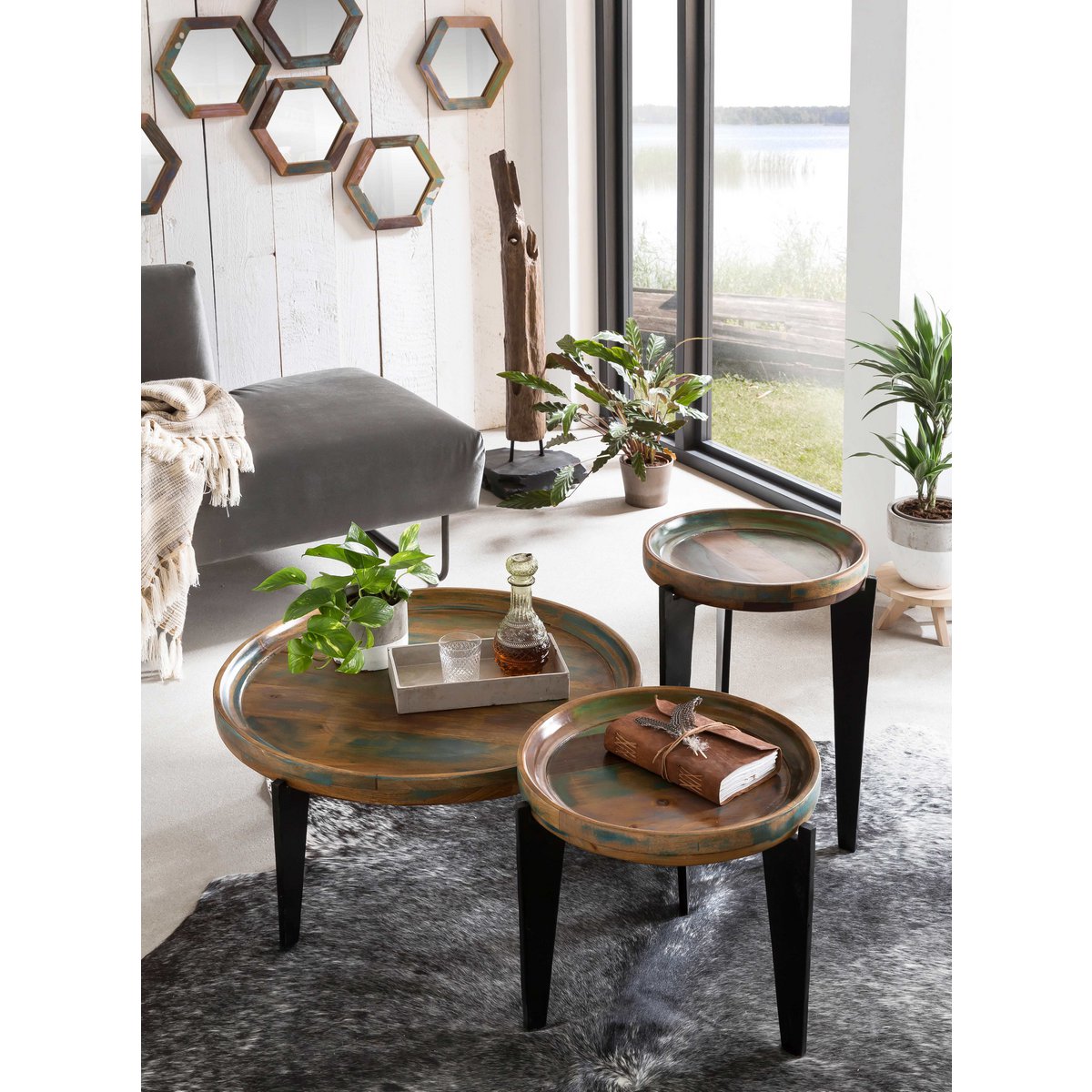 Holen Sie sich mit diesem Tisch einen Hauch Urlaub direkt in Ihr Zuhause. Der Beistelltisch überzeugt mit Charakter und Einzigartigkeit. Angefertigt aus buntem Altholz lädt der Stil des kleinen Tisches zum Träumen ein. Das dreibeinige Gestell aus Metall ist ein stylischer Kontrast zu der runden Tischplatte. Diese ist nicht nur erhöht, sondern kann auch abgenommen und als Tablett verwendet werden. Sein traditionell buntes Flair lässt es zu, dass dieser Beistelltisch sich problemlos in modernes Mobiliar integrieren lässt. Plattenstärke 20 mm auf 50 mm aufgedoppelt, Beine oben 7,5 cm, unten 3 cm breit.