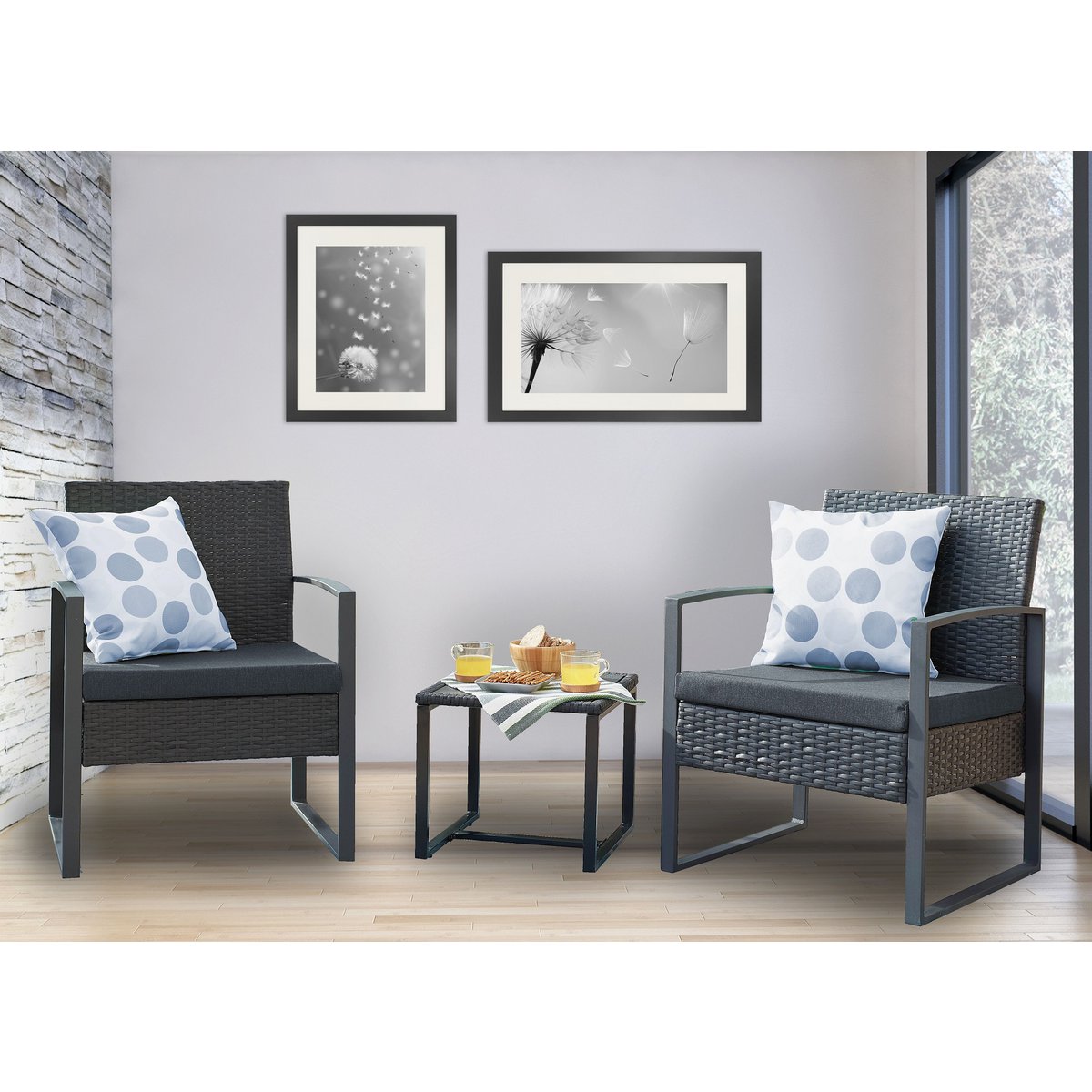 Diese 5-tlg. Gartengarnitur bietet Ihnen viel Platz und Komfort. Die Kombination aus zwei Stühlen und einem Beistelltisch ist ideal für den Kaffee in der Nachmittagssonne oder ein Glas Wein an einem lauschigen Sommerabend. Zudem sorgen die besonders dicken Sitzkissen, die Armlehnen, sowie die leicht erhöhte Rückenlehne für einen sehr angenehmen Sitzkomfort. Das Set ist wetterfest und somit bestens für den Outdoor Bereich geeignet. Selbstverständlich können Sie diese Möbel aber auch in einem Wintergarten aufstellen. Egal, wo sie platziert werden, sie zaubern einen angenehmen Urlaubsflair und sind sehr bequem. Maße des Stuhls: 60 x 62 x 80 cm, Sitzbreite: ca. 53 cm, Sitztiefe: ca. 50,5 cm, Sitzhöhe: ca. 43 cm (inkl. Höhe des Sitzkissens ca. 5 cm), Maße des Beistelltischs: 40 x 40 x 37 cm, Bezug 100% PES, Füllmaterial Schaumstoff, Gestell pulverbeschichtet.