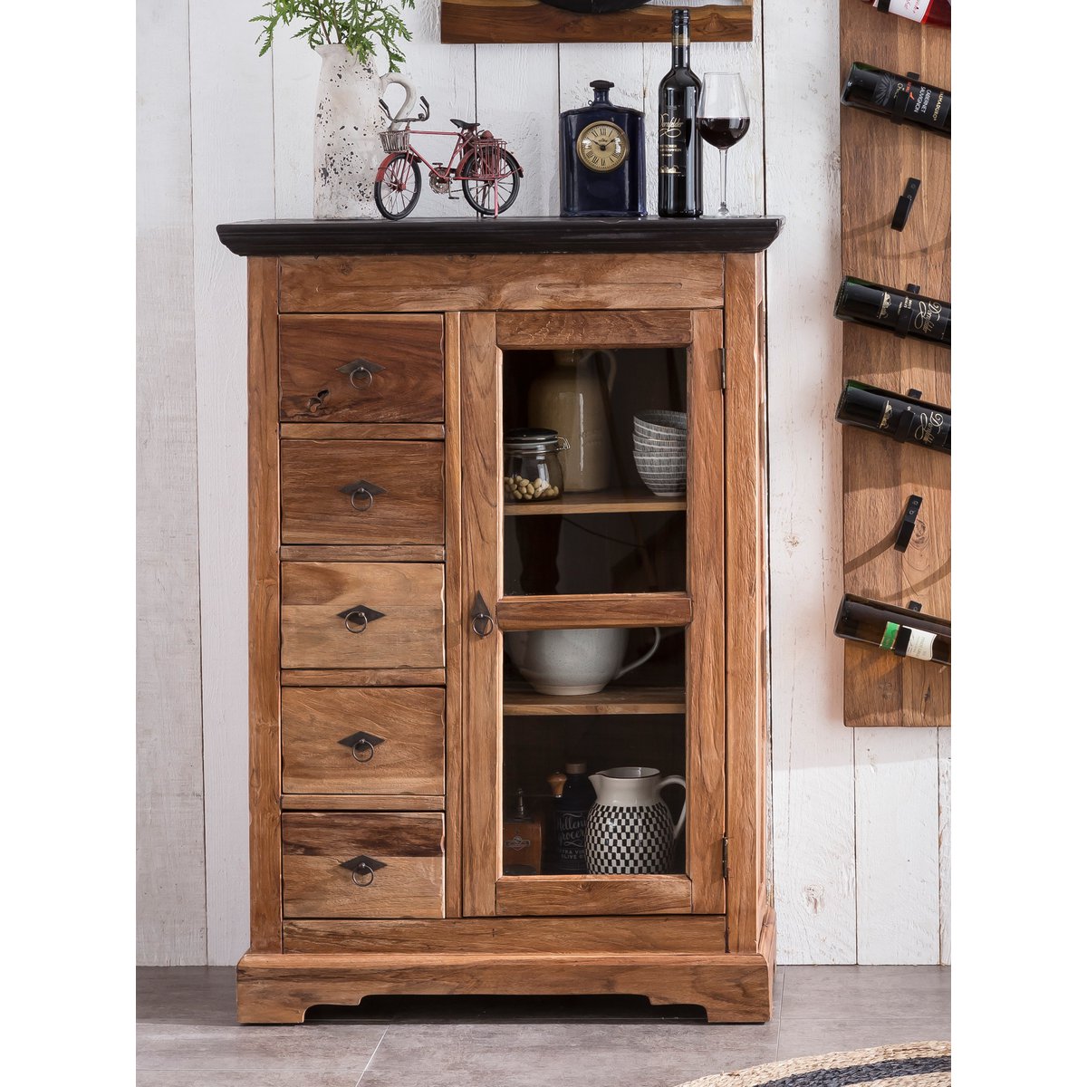 Ein attraktiver Blickfang ins Wohn- oder Esszimmer ist dieser Brotschank aus recyceltem Teak. Er punktet mit einem Mix aus recyceltem Holz in warmem Naturton und Metallringgriffen. Der Materialmix von warmem Holz und derben Metall liegt voll im Trend und sorgt für interessante Kontraste in der Optik. Neben seiner Optik überzeugt er mit fühlbarer Struktur. Der Brottisch lässt sich harmonisch in verschiedene Wohnprogramme integrieren. Hinter Fünf Schubladen und einer Tür verbirgt sich jede Menge geschlossener Stauraum, in dem Alltagsgegenstände, die man gerne verstecken möchte Platz finden. Gefertigt wird der Schrank aus wiederverarbeitetem Holz alter Scheunen und Häuser - jedes Stück ist ein Unikat. Sorgt für eine wohnliche Atmosphäre: der Brotschrank mit modernem Materialmix. Holzauszüge an den Schubladen.