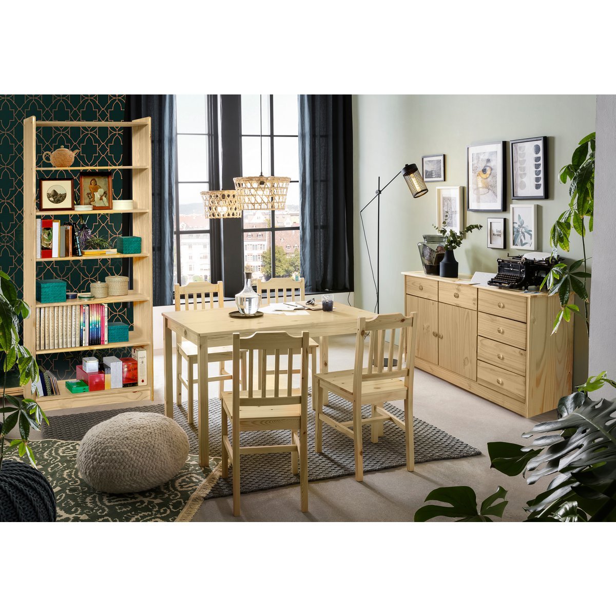 Dieses Bücherregal aus massivem Kiefernholz mit vier Böden kombiniert natürliche Schönheit mit praktischer Funktionalität. Das hochwertige Kiefernholz verleiht Ihrem Raum eine warme, einladende Atmosphäre und überzeugt durch seine Nachhaltigkeit und Robustheit. Die vier stabilen Böden bieten ausreichend Platz für Bücher, Dekorationsgegenstände oder persönliche Schätze. Mit seiner klaren Linienführung und dem schlichten Design passt es nahtlos in verschiedene Wohnräume wie Wohnzimmer, Arbeitszimmer oder Schlafzimmer. Dieses Bücherregal ist nicht nur funktional, sondern auch ein stilvoller Blickfang. Die pflegeleichte, glatte Oberfläche behält über lange Zeit hinweg ihr attraktives Aussehen. Bringen Sie Ordnung und natürliche Eleganz in Ihr Zuhause mit diesem zeitlosen Bücherregal aus massivem Kiefernholz. 5 Böden
