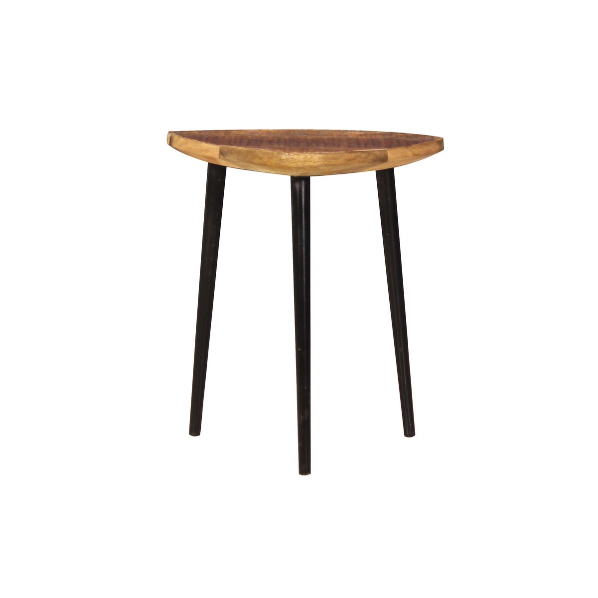 Dieser Couchtisch oder Beistelltisch aus naturfarbigem Mangoholz mit schwarzen Beinen ist eine Bereicherung in jedem Ambiente. Die dreieckige Form mit abgerundeten Ecken und drei konisch zulaufenden Metallbeinen lassen ihn zudem etwas Retro wirken. Der Materialmix von rustikalem Holz in warmem Naturton und glattem Metall liegt voll im Trend und sorgt für interessante Kontraste in der Optik und schafft eine wohnliche Atmosphäre. Plattenstärke 25 mm.
