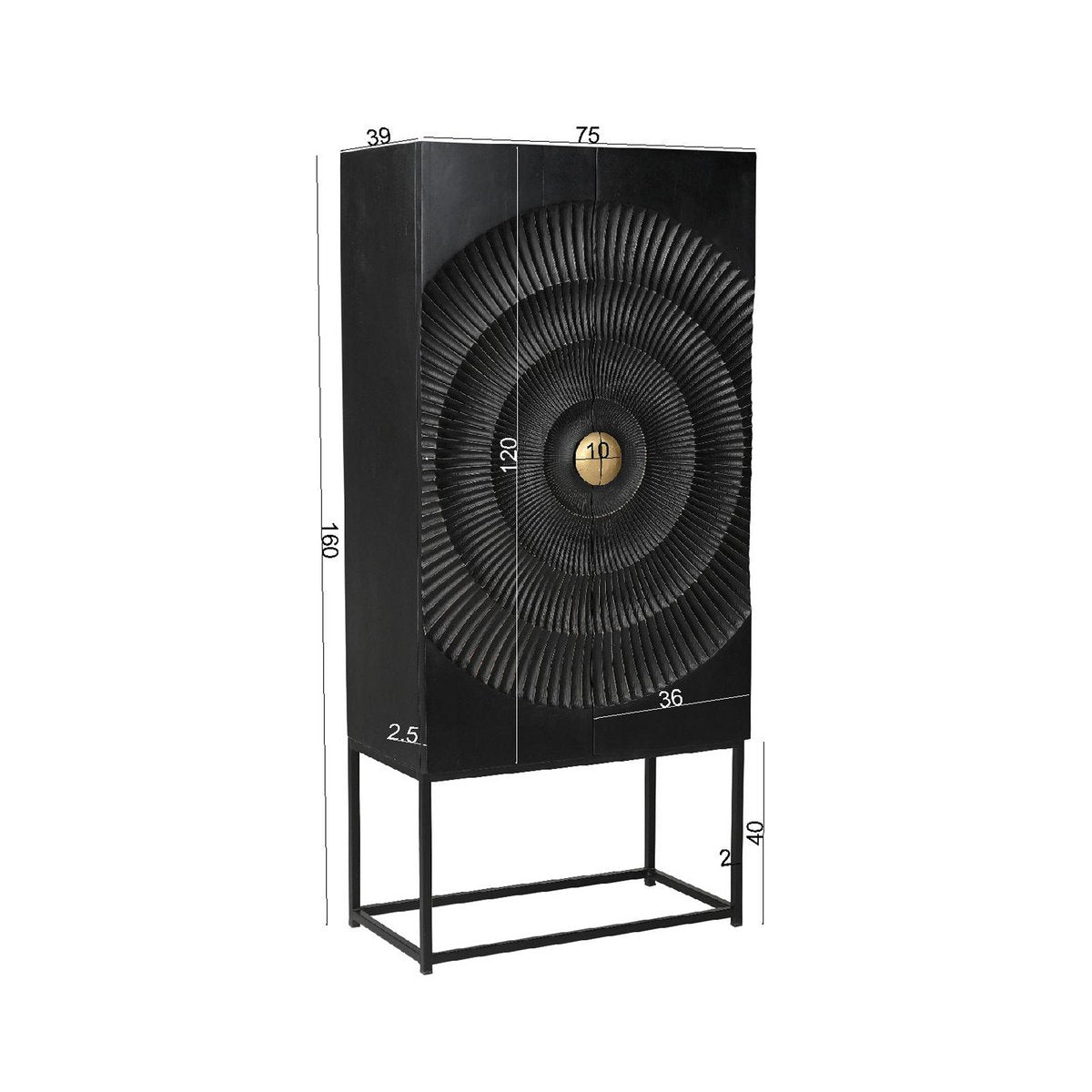 Ein Schrank kann weit mehr sein als nur ein funktionales Möbelstück – er kann das Herzstück eines Raumes sein und gleichzeitig Ordnung schaffen. Der elegante Schrank aus massivem schwarzem Mangoholz vereint modernes Design, natürliche Materialien und kunstvolle Details zu einem Möbelstück, das sowohl praktisch als auch ästhetisch überzeugt. Das Highlight dieses Schranks ist das kunstvolle, runde Schnitzmuster auf den Türen. Die feinen Details verleihen dem schwarzen Mangoholz eine edle, handwerkliche Note, die den natürlichen Charakter des Materials unterstreicht. Der goldene Metallgriff in der Mitte setzt einen luxuriösen Akzent und hebt sich stilvoll vom dunklen Holz ab. Gefertigt aus robustem, massivem Mangoholz, steht dieser Schrank für Langlebigkeit und Qualität. Das schwarze Metallgestell verleiht dem Design eine moderne Leichtigkeit und sorgt gleichzeitig für Stabilität. Diese Kombination aus Holz und Metall macht den Schrank vielseitig einsetzbar – perfekt für Wohn-, Schlaf- oder Esszimmer. Hinter den zwei kunstvoll gestalteten Türen verbirgt sich ein durchdachter Innenraum mit drei großzügigen Fächern. Ob Geschirr, Bücher oder Kleidung – dieser Schrank bietet genügend Platz für all Ihre Lieblingsstücke und hält Ihren Raum aufgeräumt. Ob als Stauraum im Wohnzimmer, als Kleiderschrank im Schlafzimmer oder als stilvoller Akzent im Flur – dieser Schrank fügt sich harmonisch in verschiedenste Einrichtungsstile ein und setzt dabei einen besonderen Akzent. Höhe des Gestells: ca. 40 cm, Höhe des Korpus: ca. 120 cm, Rahmenbreite Korpus: ca. 2,5 cm, Maße der Türen: 2x ca. 36x120 cm, Rahmenbreite Gestell ca. 2x2 cm, innen 2 Böden/3 Fächer, Tiefe des Gestells: ca. 36,5 cm, Ø Griff: 10 cm