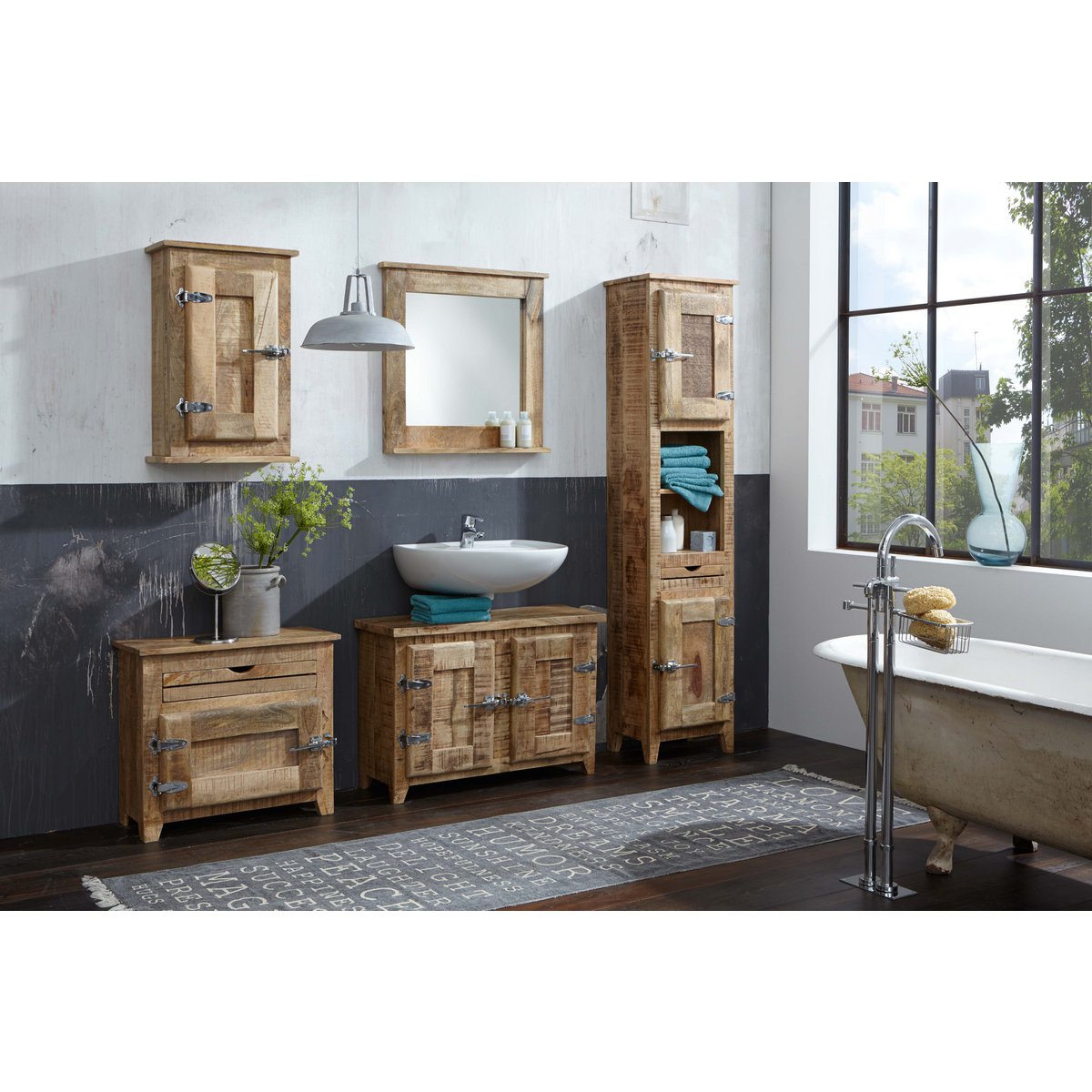 Holen Sie sich mit diesem Bad-Set das gewisse Etwas in Ihr Badezimmer. Ein Hochschrank, eine kleine Kommode, ein Hängeschrank und der Waschbecken-Unterschrank bieten genug Platz für Handtücher, Putzmittel und Co, dazu noch ein Spiegel mit Ablage. Die natürliche Maserung und Struktur des Mangholzes ist sichtbar und verleiht den Badmöbeln eine schicke Note. Der charakteristische goldene Farbton des Holzes verleiht dem Raum Wärme und harmoniert optimal mit den meisten Farben. Besonderes Highlight sind die silberfarbenen Kühlschrankgriffe, welche als Tür Hebel dienen. Für ein ansprechendes Ambiente im Badezimmer eine gute Wahl. Hochschrank 42x30x188 cm, Unterschrank 87x30x60 cm, Spiegel 67x5x68 cm, kleiner Schrank 70x30x60 cm, Hängeschrank 40x20x70 cm, Anschlag jeweils wählbar.